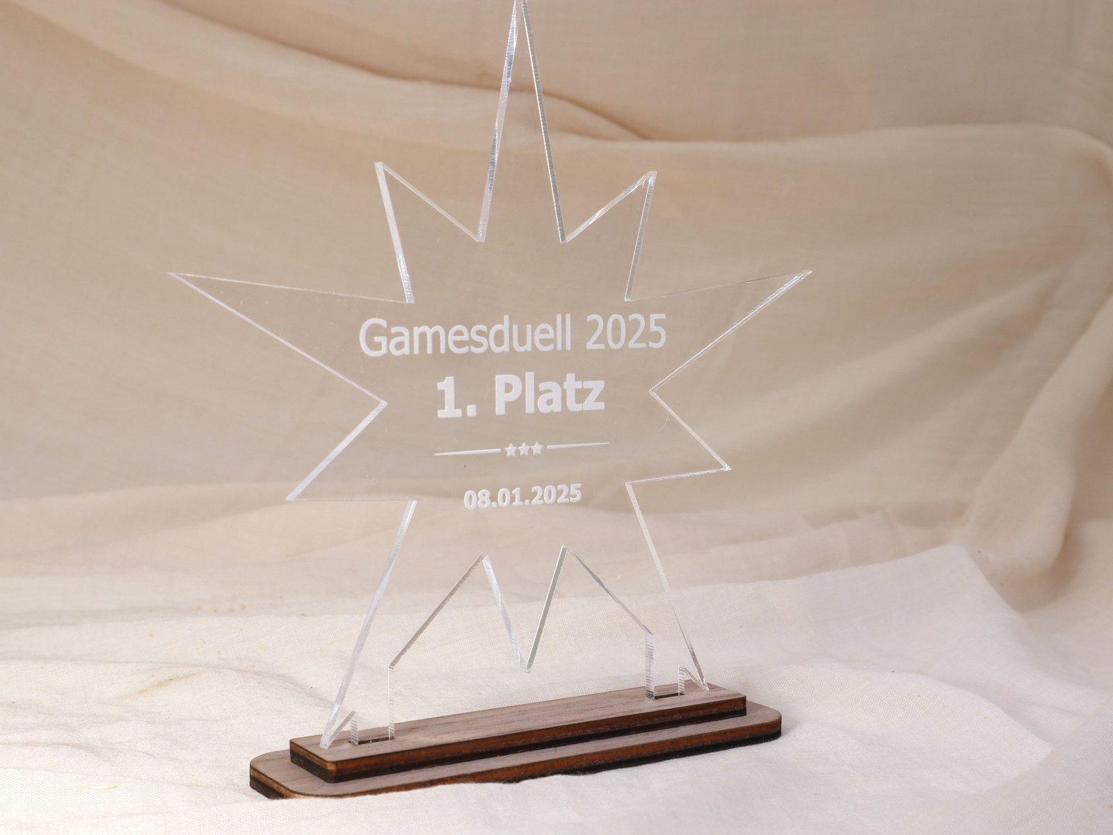 Außergewöhnliches Design in Acrylglas – Die doppel Sternen Trophäe in Kombination aus transparenten Acrylglas mit persönlicher Gravur.