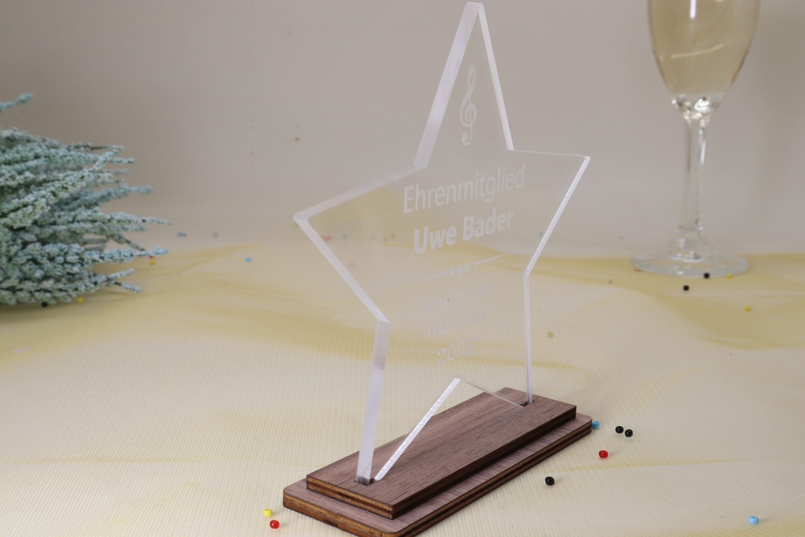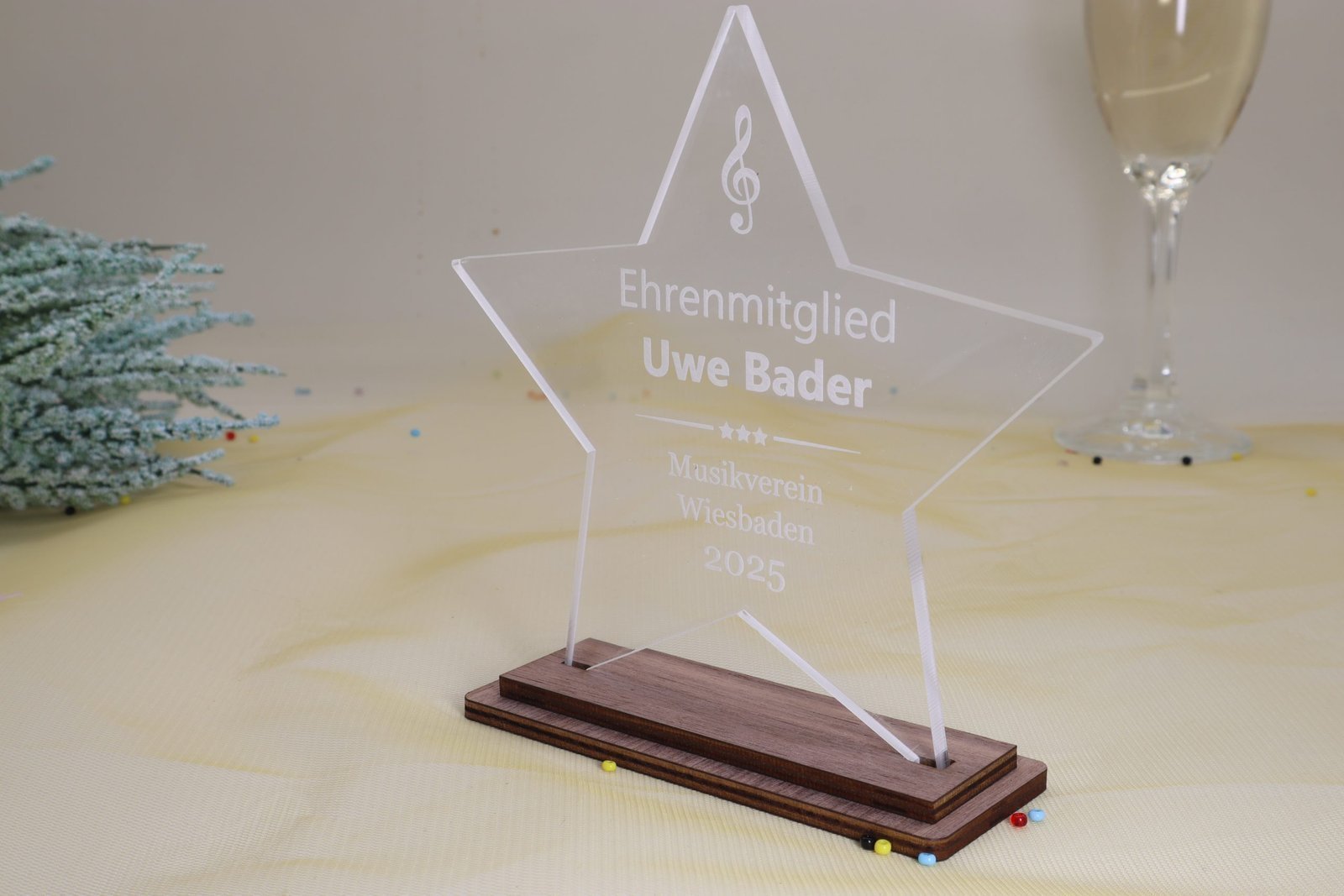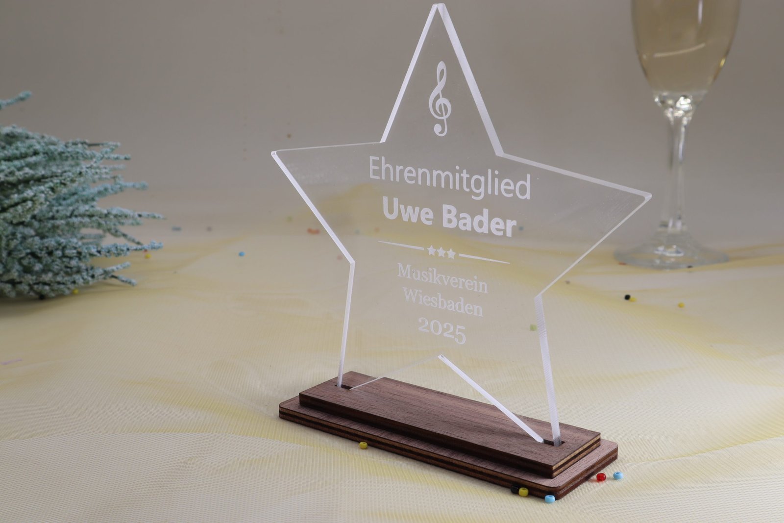 Eleganz in Harmonie – Die Sternen Trophäe aus edlem Nussbaum mit Acrylglas und persönlicher Gravur. Das 5 mm Acryl Glas bietet durch seine Stärke einen besonderen Tiefeneindruck der Gravur.