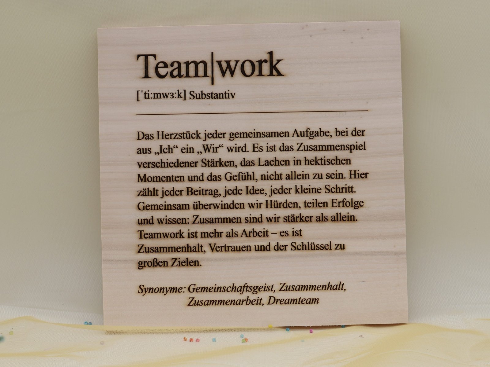 Ob als Geschenk für ein Team, eine Organisation oder zur eigenen Motivation – unser Holzbild „TEAMWORK“ ist ein zeitloses Stück, das sowohl ästhetisch ansprechend als auch bedeutungsvoll ist. Holen Sie sich ein Stück Inspiration in Ihr Zuhause oder Ihre Arbeitsumgebung!