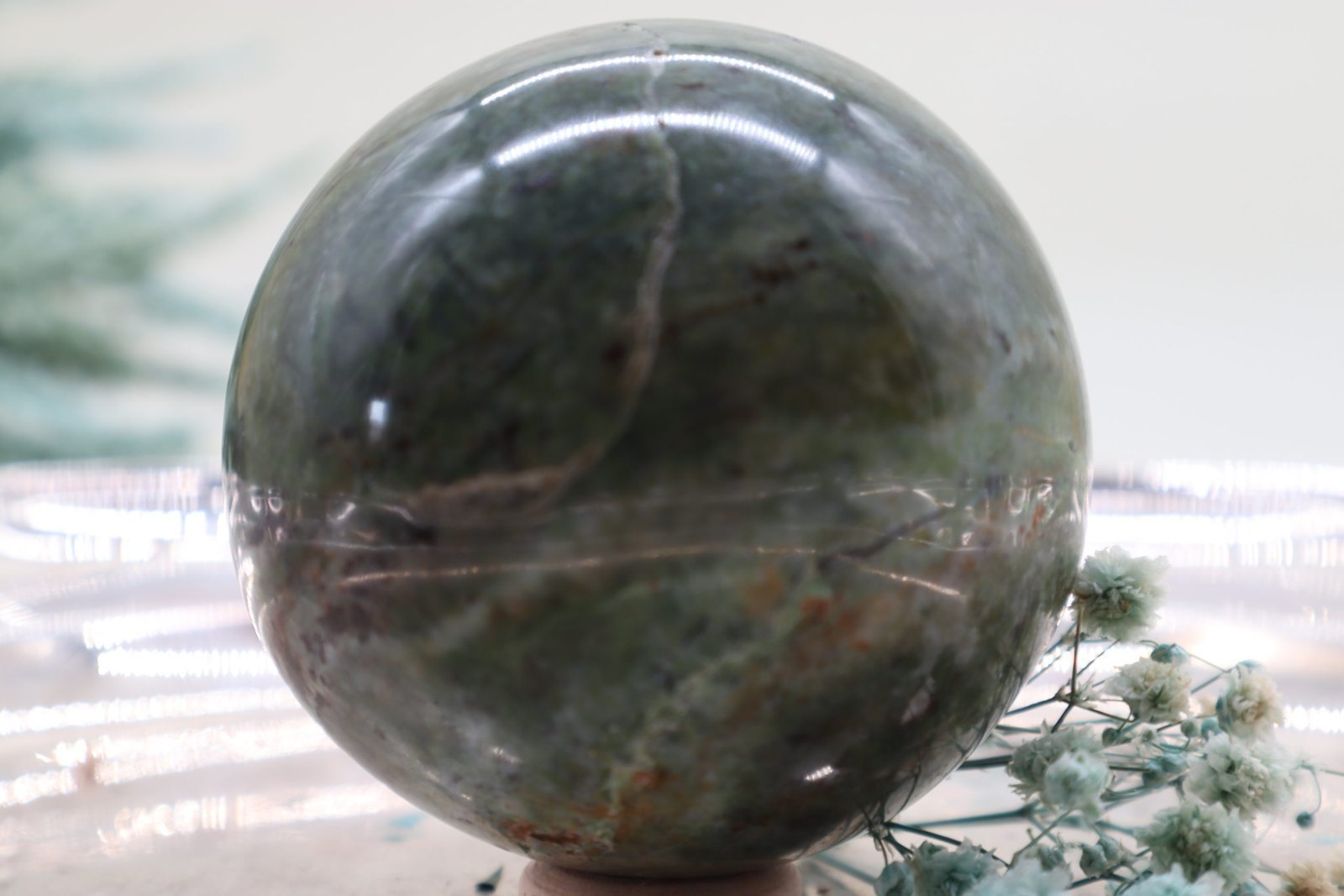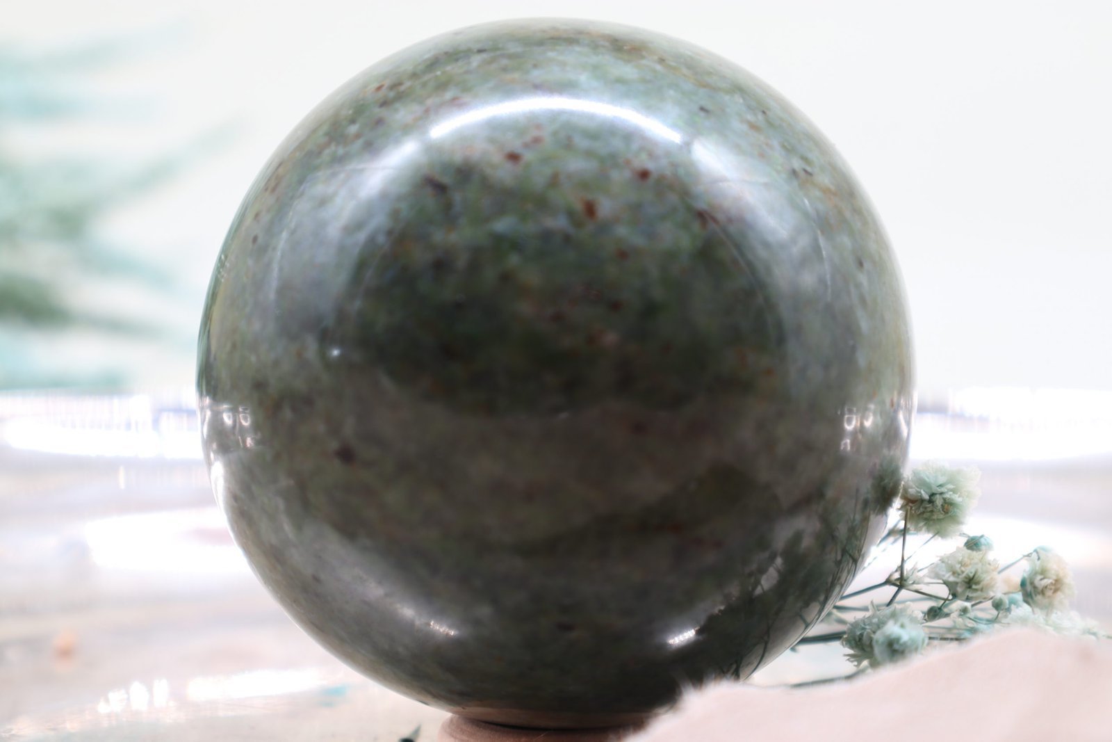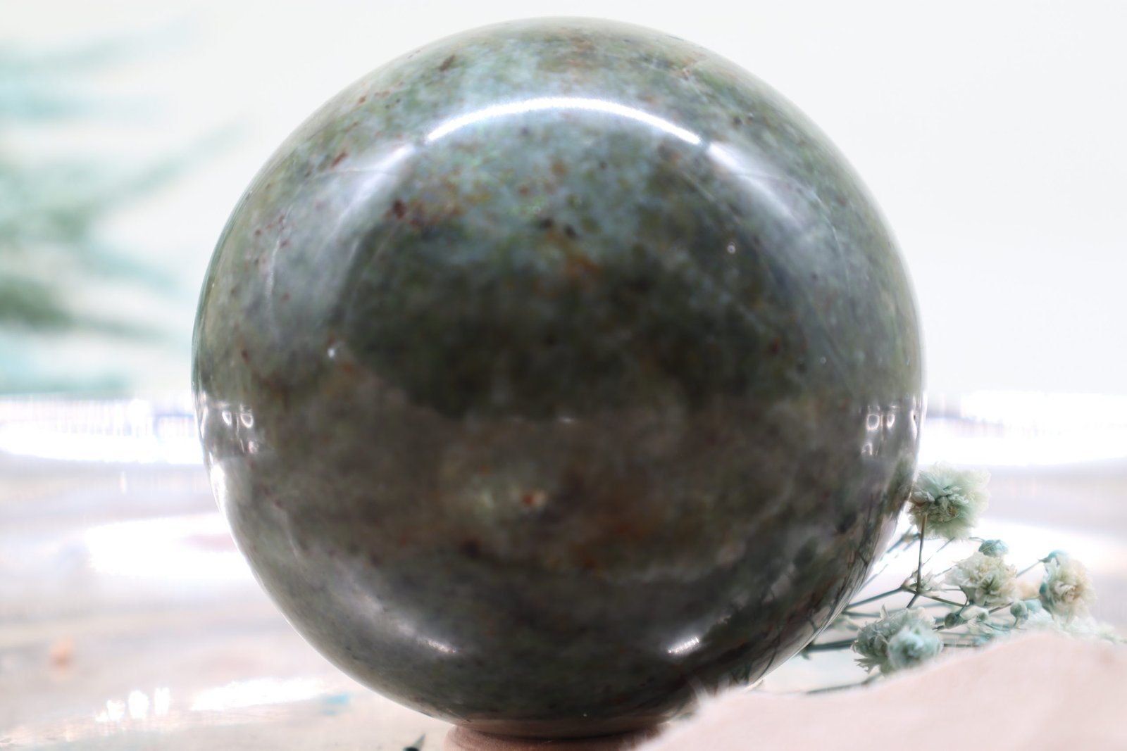 - Die Kugel hat eine glatte, hochpolierte Oberfläche, die die Farbe und den natürlichen Glanz des Steins betont. Beim Berühren fühlt sie sich kühl und glatt an, fast wie Glas, und sie reflektiert das Licht auf eine sanfte, aber brillante Weise.