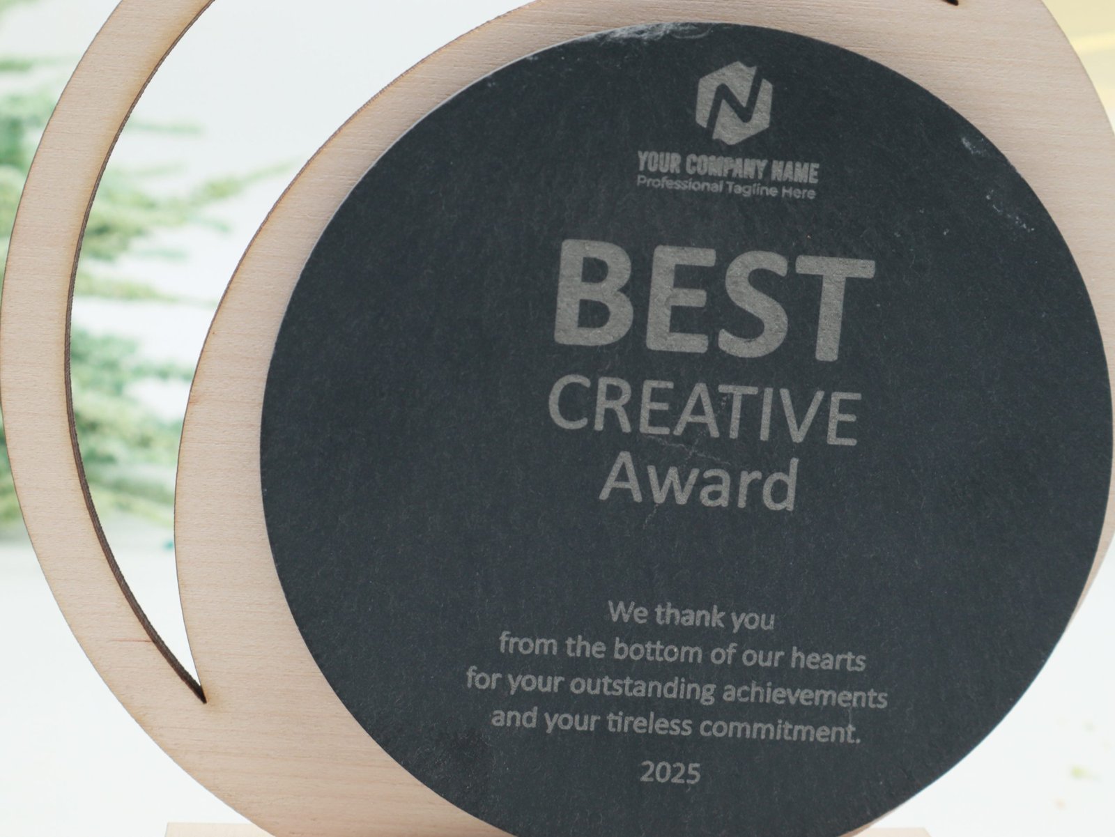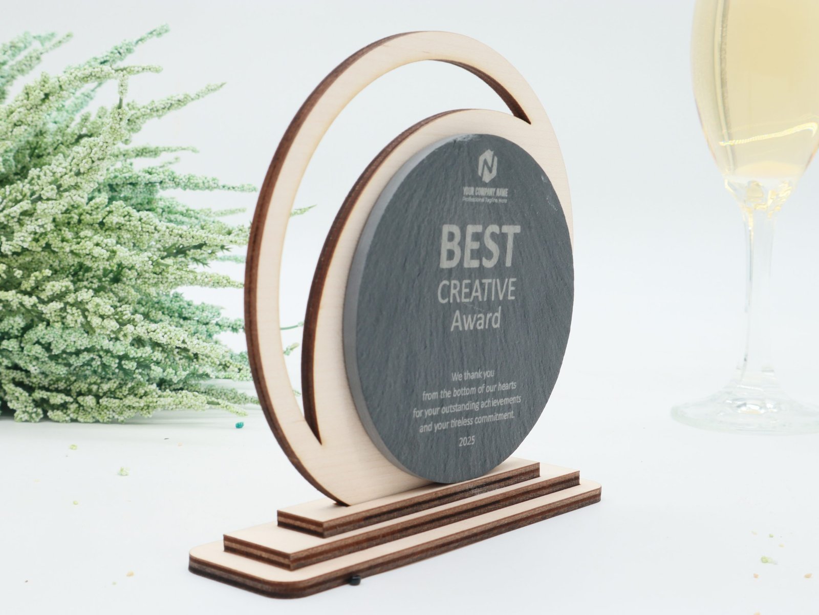 Entdecken Sie unsere einzigartige Trophäe aus edlem Ahornholz und einer stilvollen Schieferplatte, die speziell für Sie graviert wird. Ideal für Auszeichnungen, Ehrungen und besondere Anlässe – gestalten Sie Ihren Award ganz nach Ihren Wünschen!