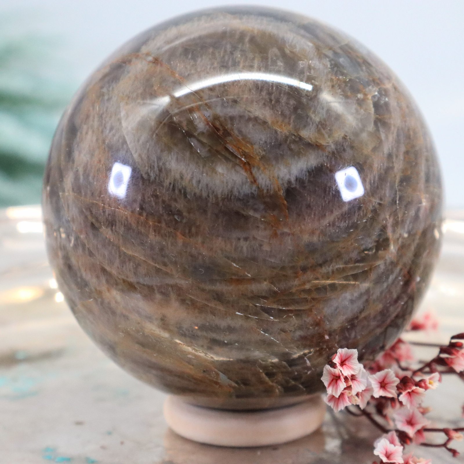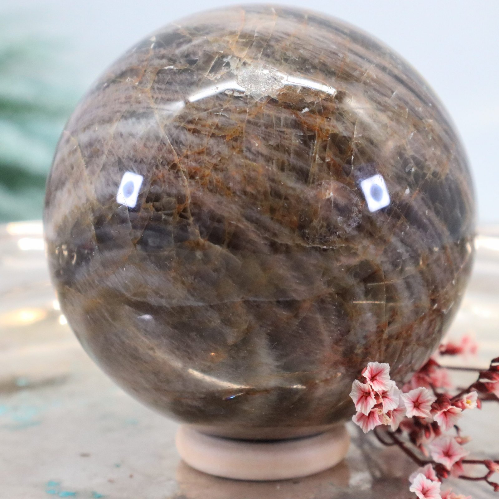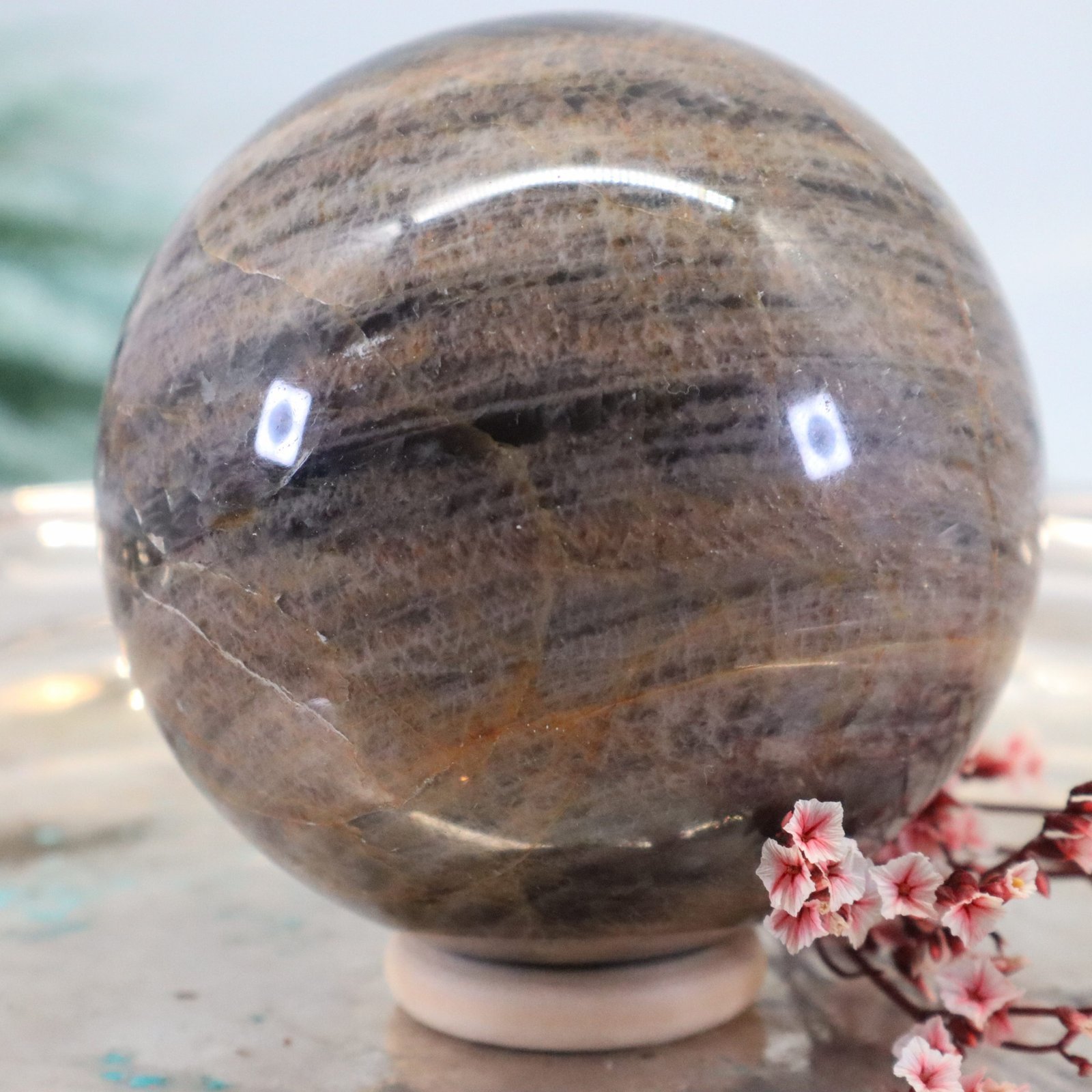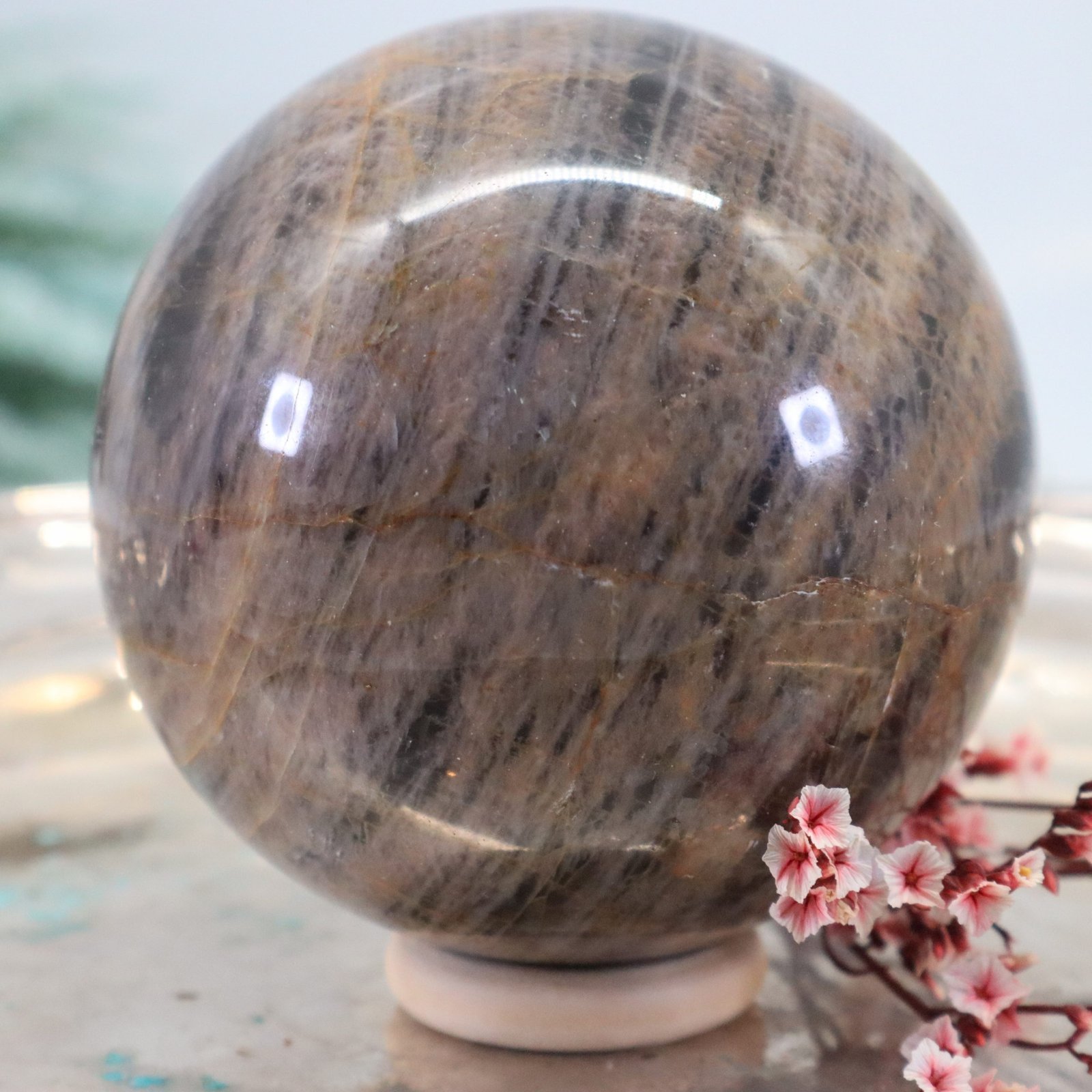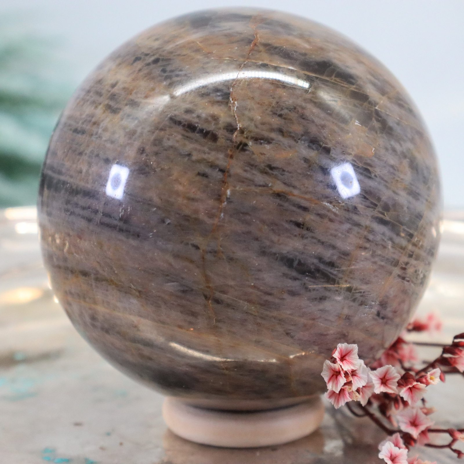 Große Schwarze Mondstein Edelsteinkugel mit wunderbarem Farbspiel