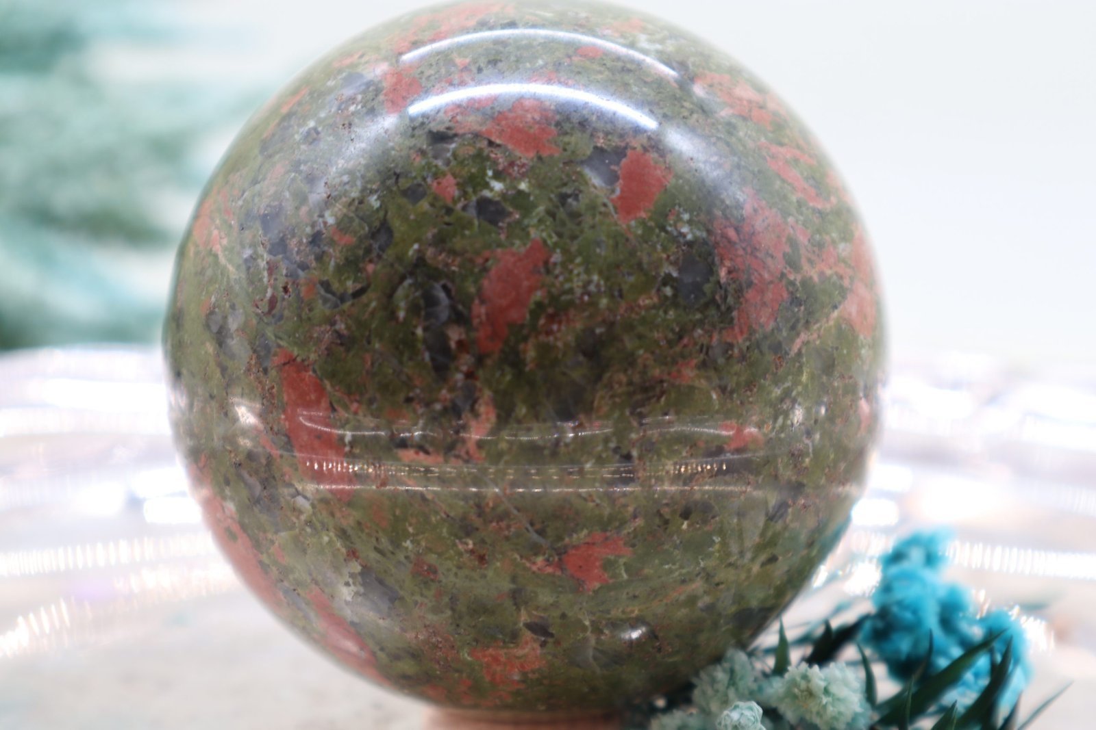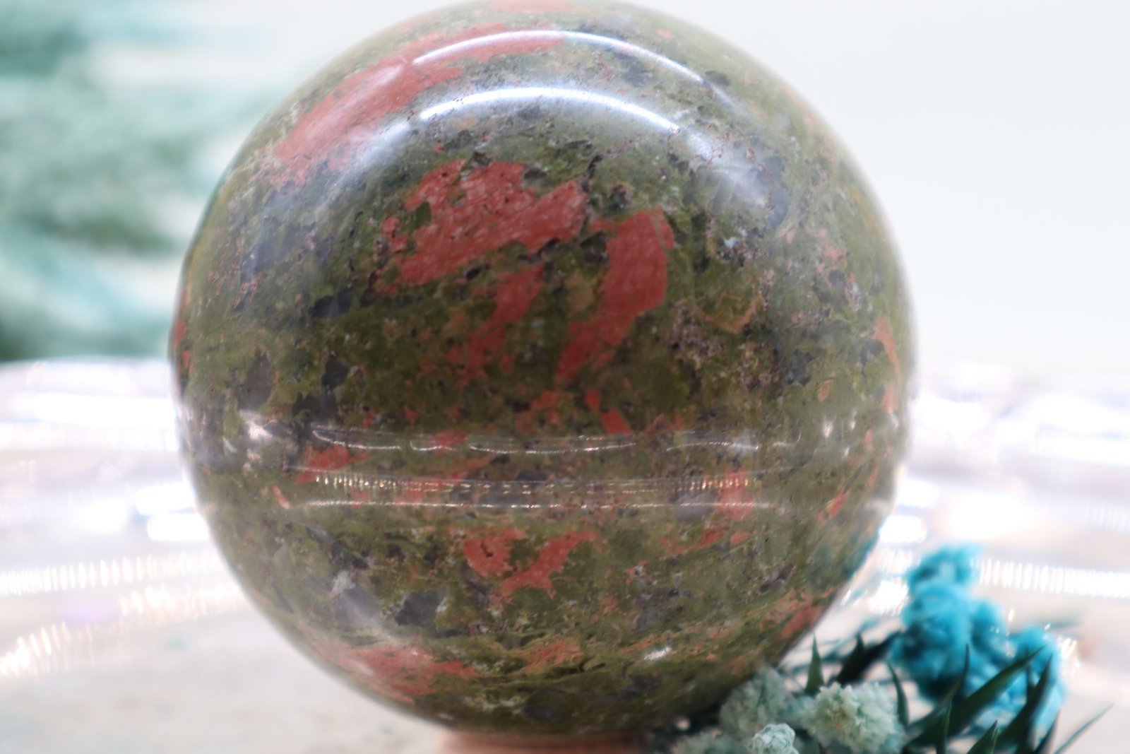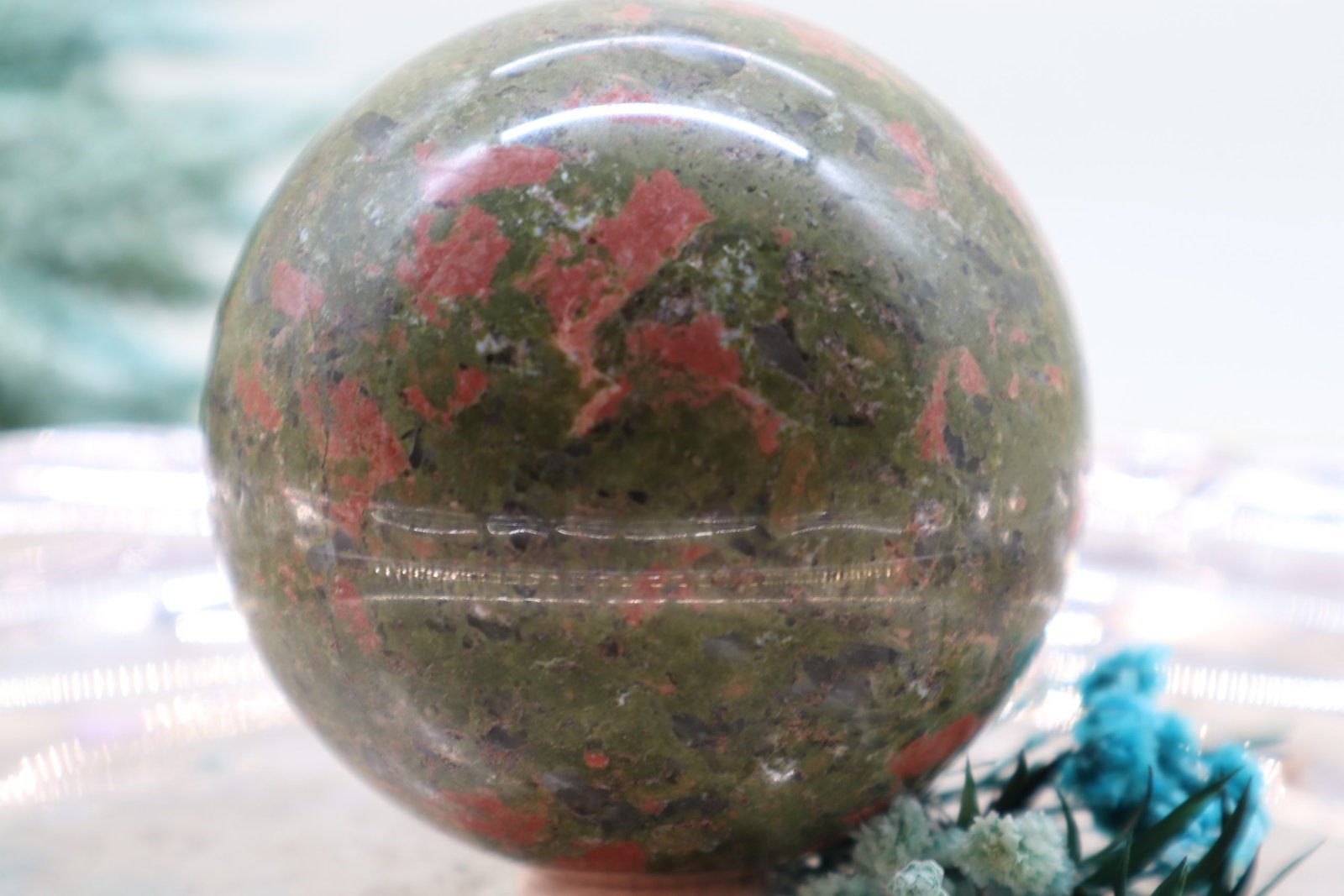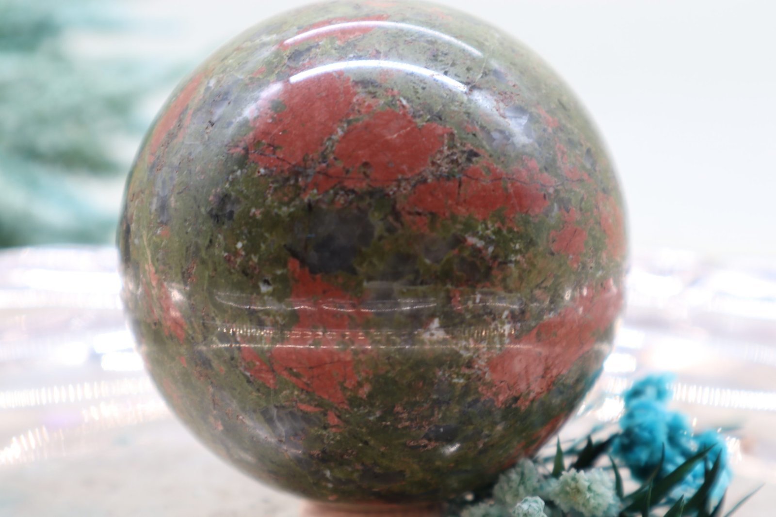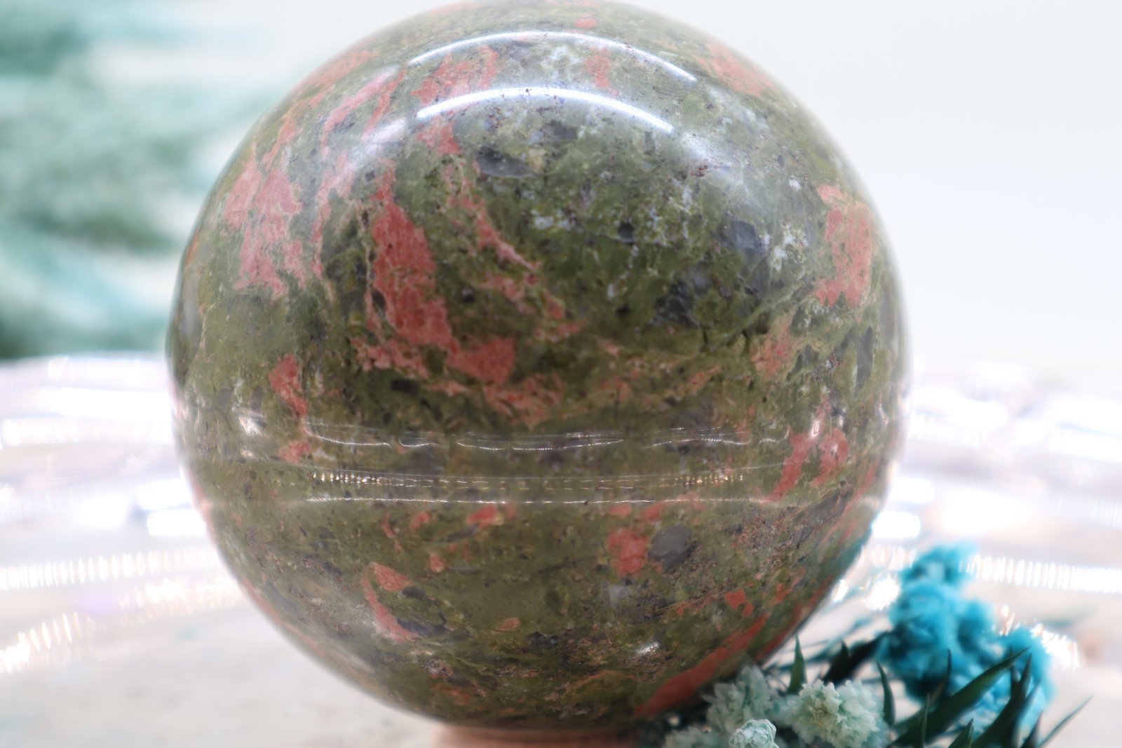 Eine Unakit-Epidot-Edelsteinkugel ist ein wunderschöner, polierter Edelstein, der vor allem für seine charakteristische Farbkombination und seine energetischen Eigenschaften bekannt ist. Hier ist eine Beschreibung der typischen Merkmale: