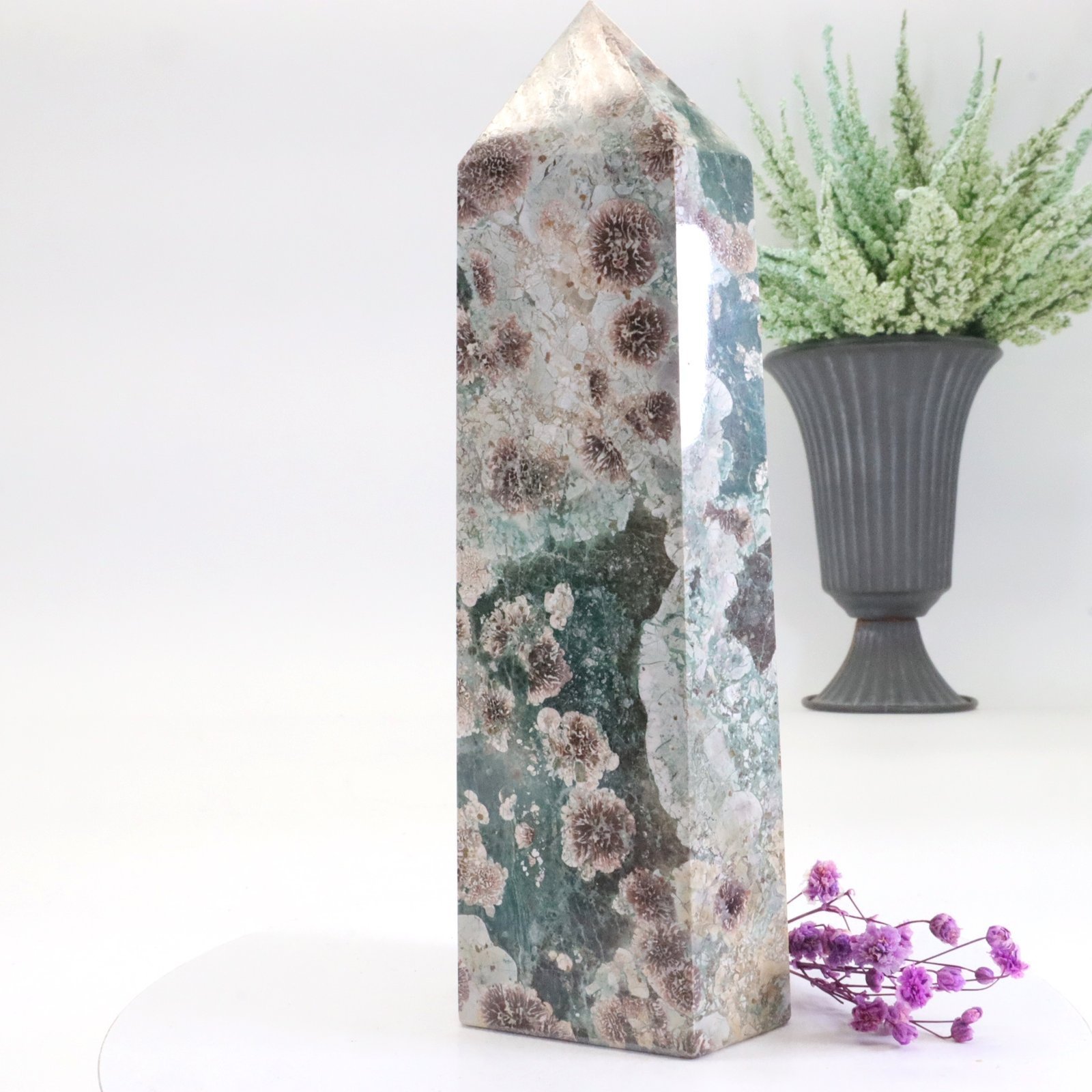 Er erstrahlt majestätisch: unser großer, edle und elegante Edelsteinturm aus grünem Blumenachat. Dieser wundervolle Schatz der Erde erzählt eine Geschichte der Natur, die durch Zeit und Druck geformt wurde, um in seiner Vollkommenheit zu erblühen.