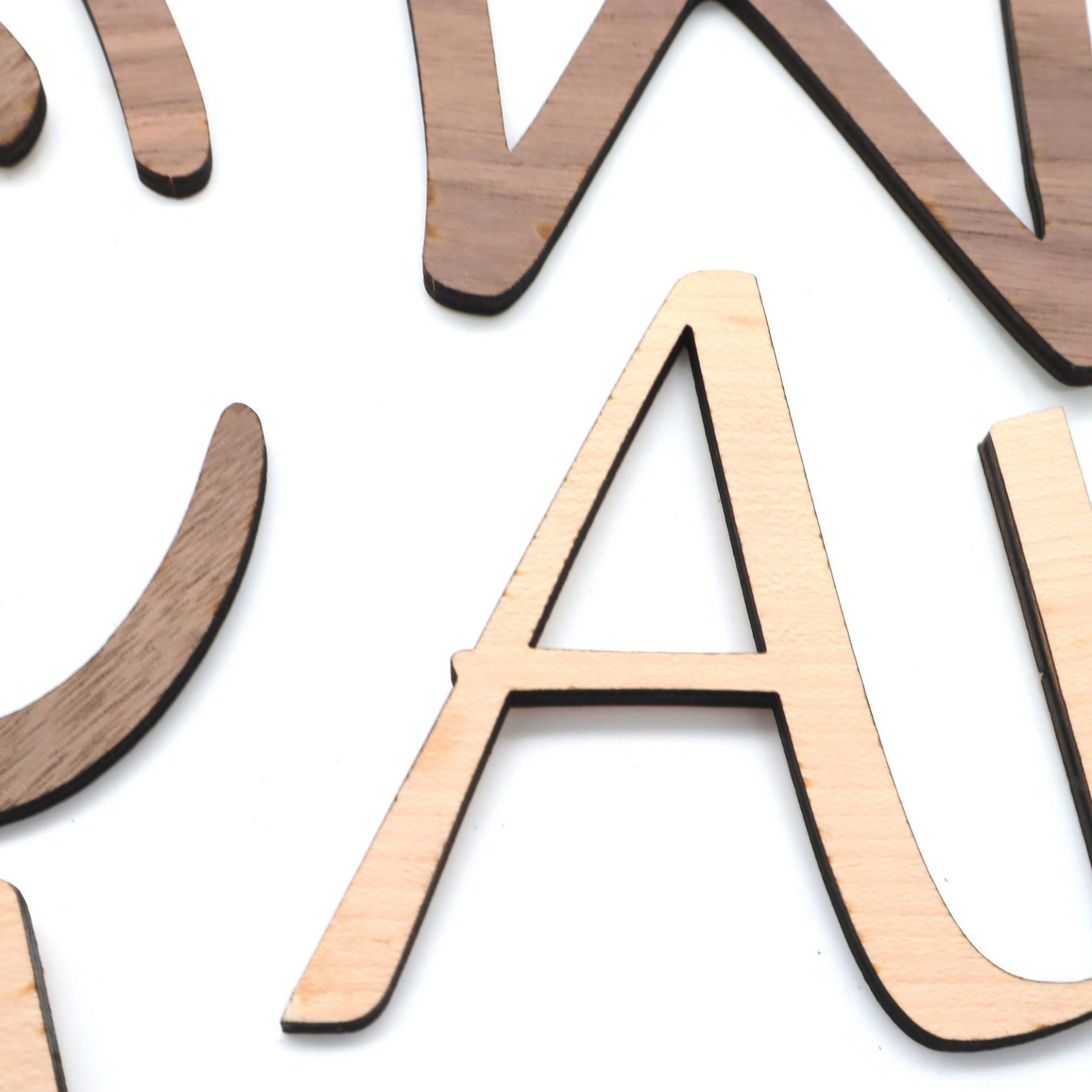 Die lasergeschnittenen Holz-Buchstaben aus naturbelassenen Nussbaum- oder Ahornsperrholz sind einfach wunderschön!