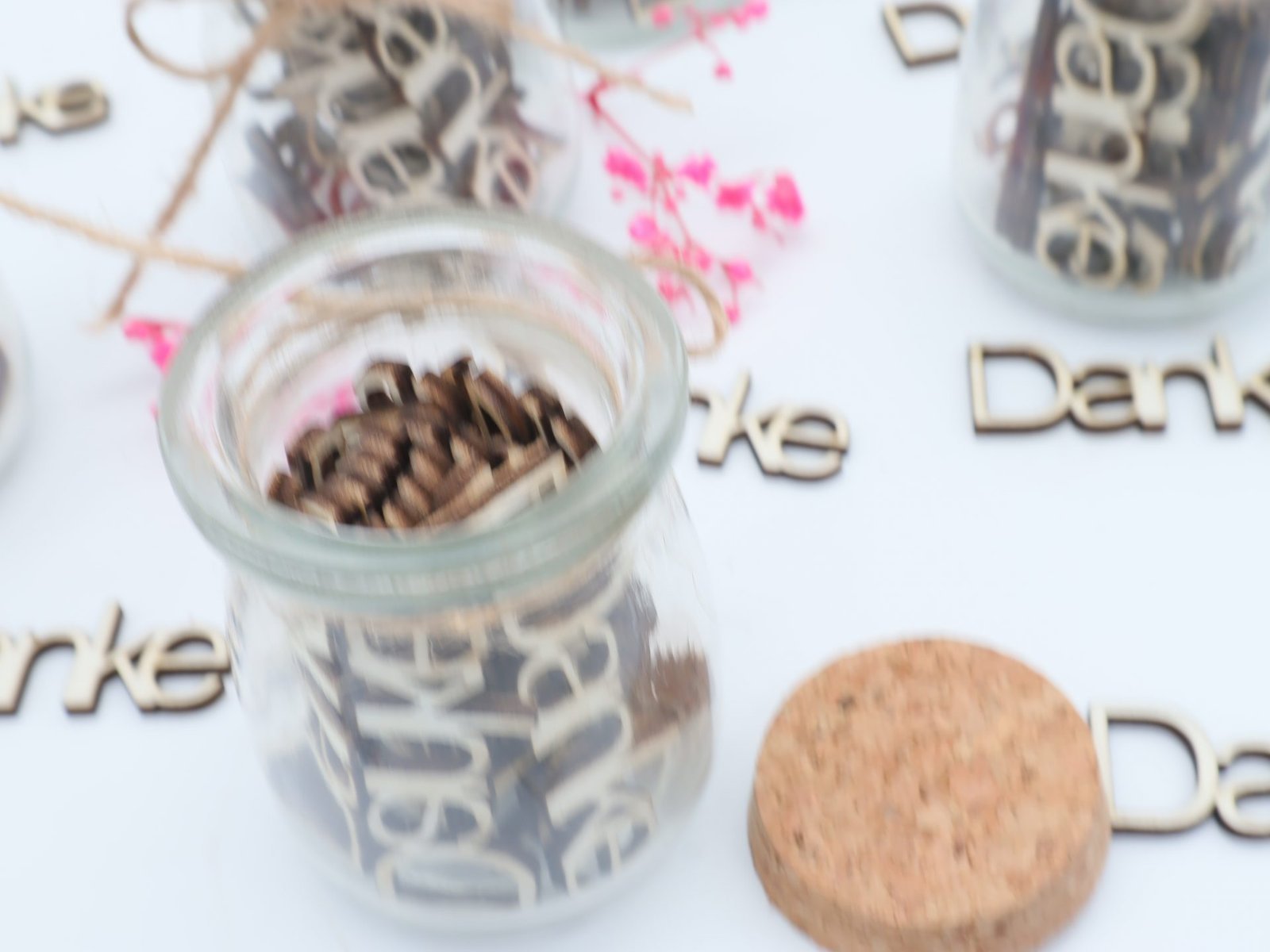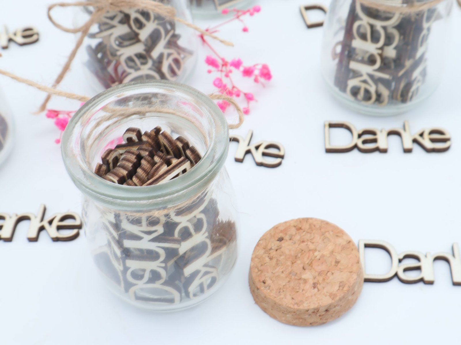 Dieses einzigartige Geschenkglas verfügt über aus Holz ausgeschnittene Worte „DANKE“.