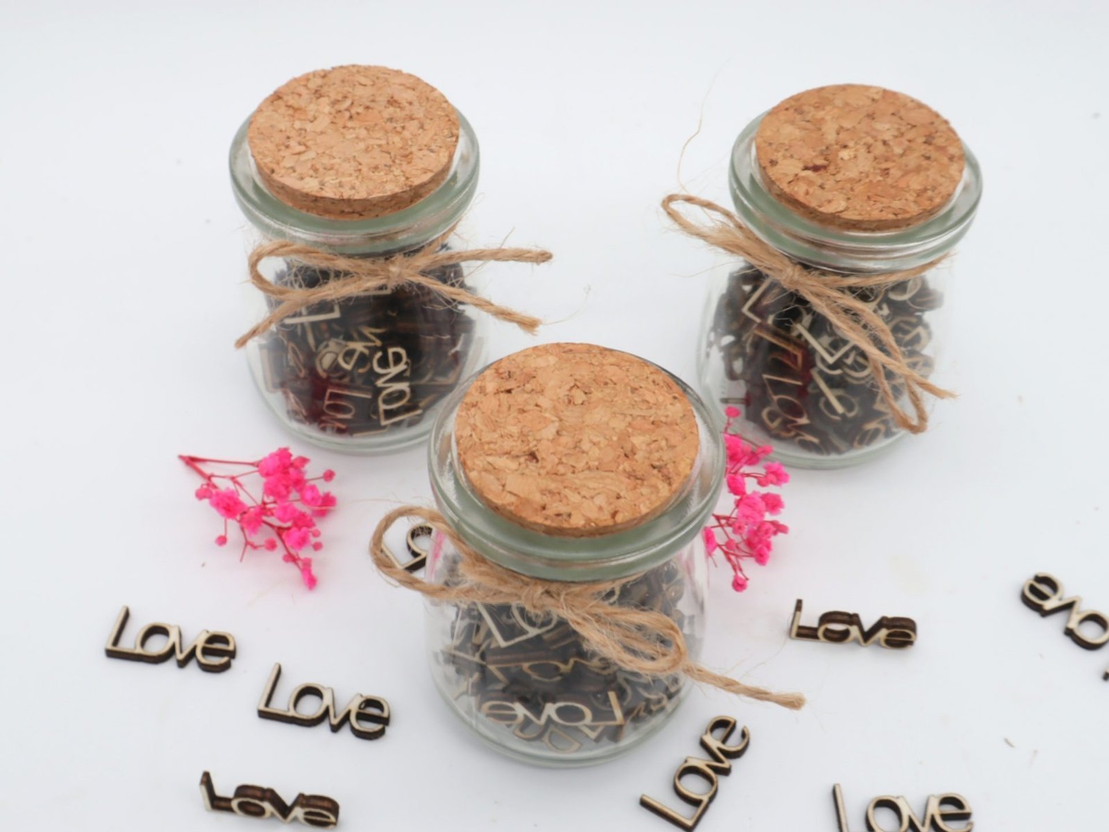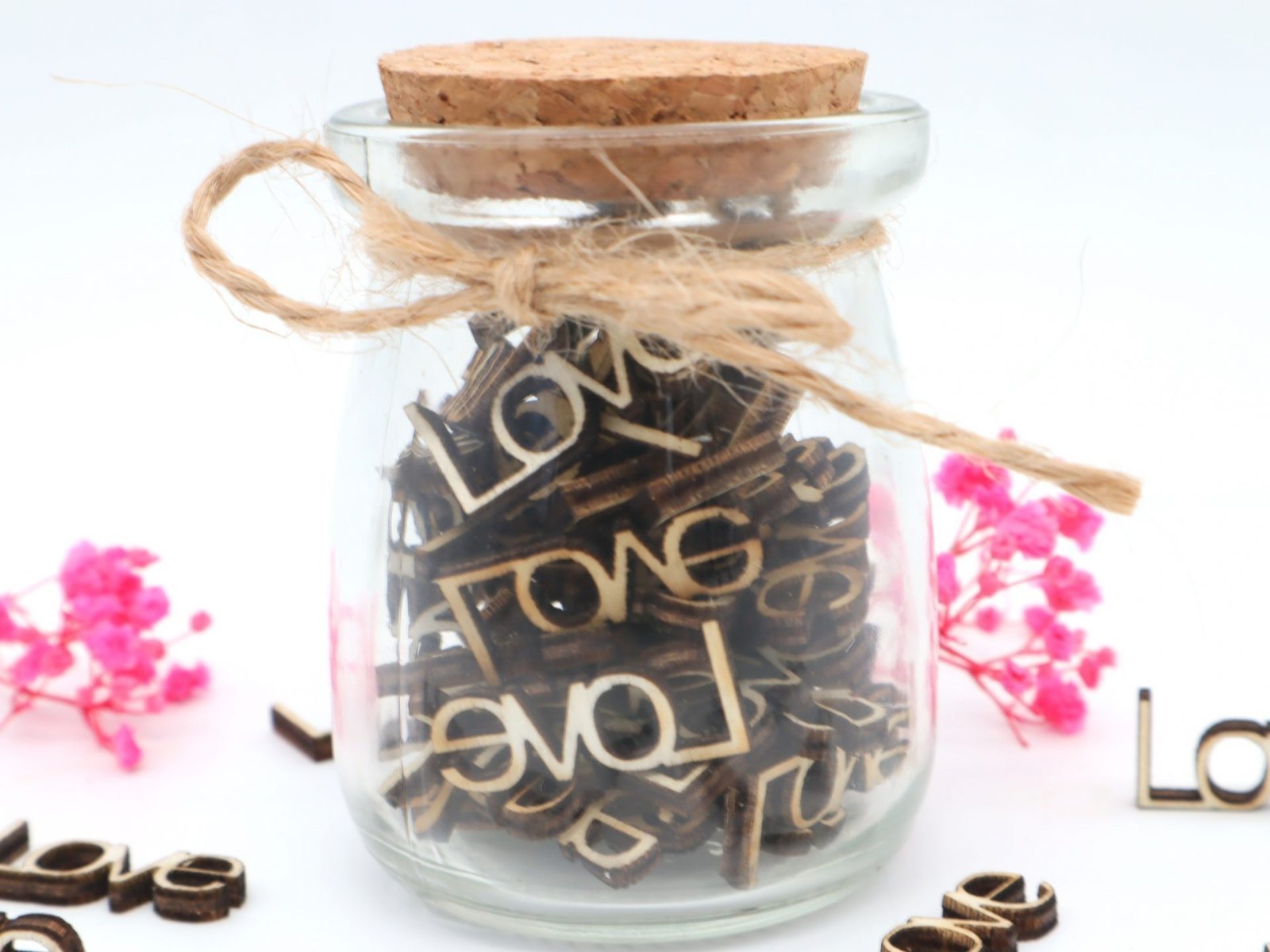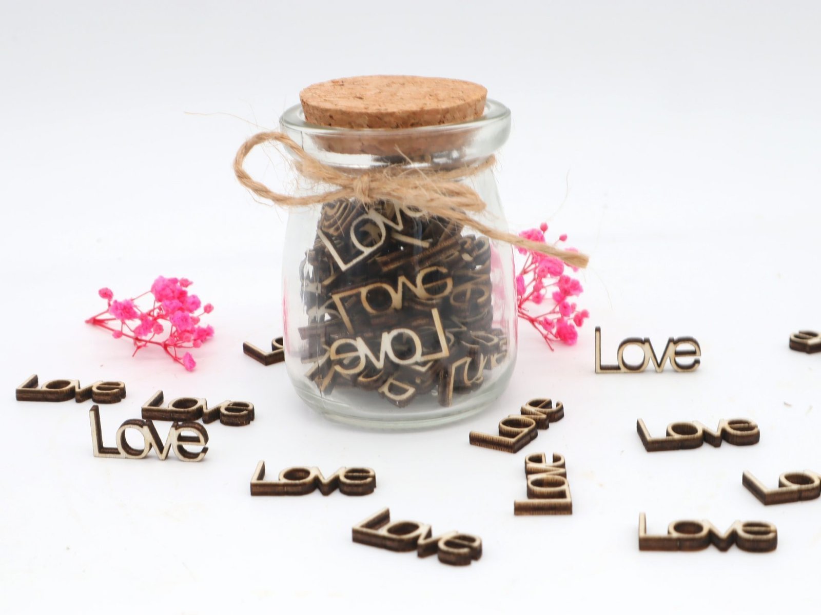 Dieses einzigartige Geschenkglas verfügt über aus Holz ausgeschnittene Worte „LOVE“.