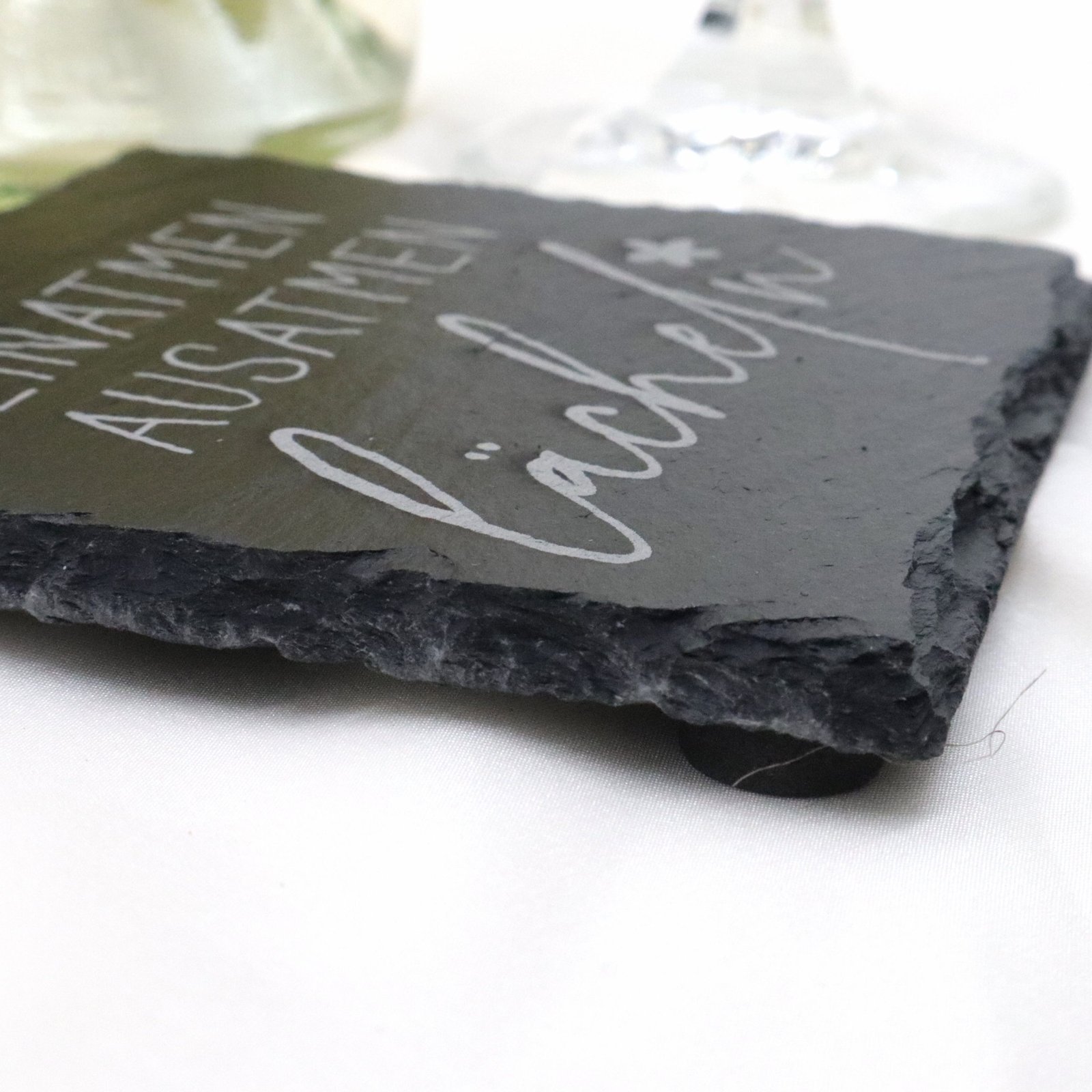 Setzen Sie ein Zeichen der Wertschätzung mit unseren hochwertigen Schieferuntersetzern, graviert mit der herzlichen Botschaft: „Ein Atmen Aus Atmen Lächeln“