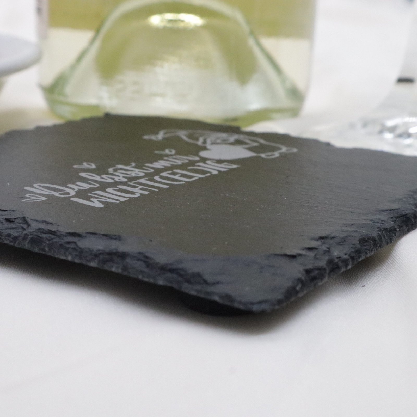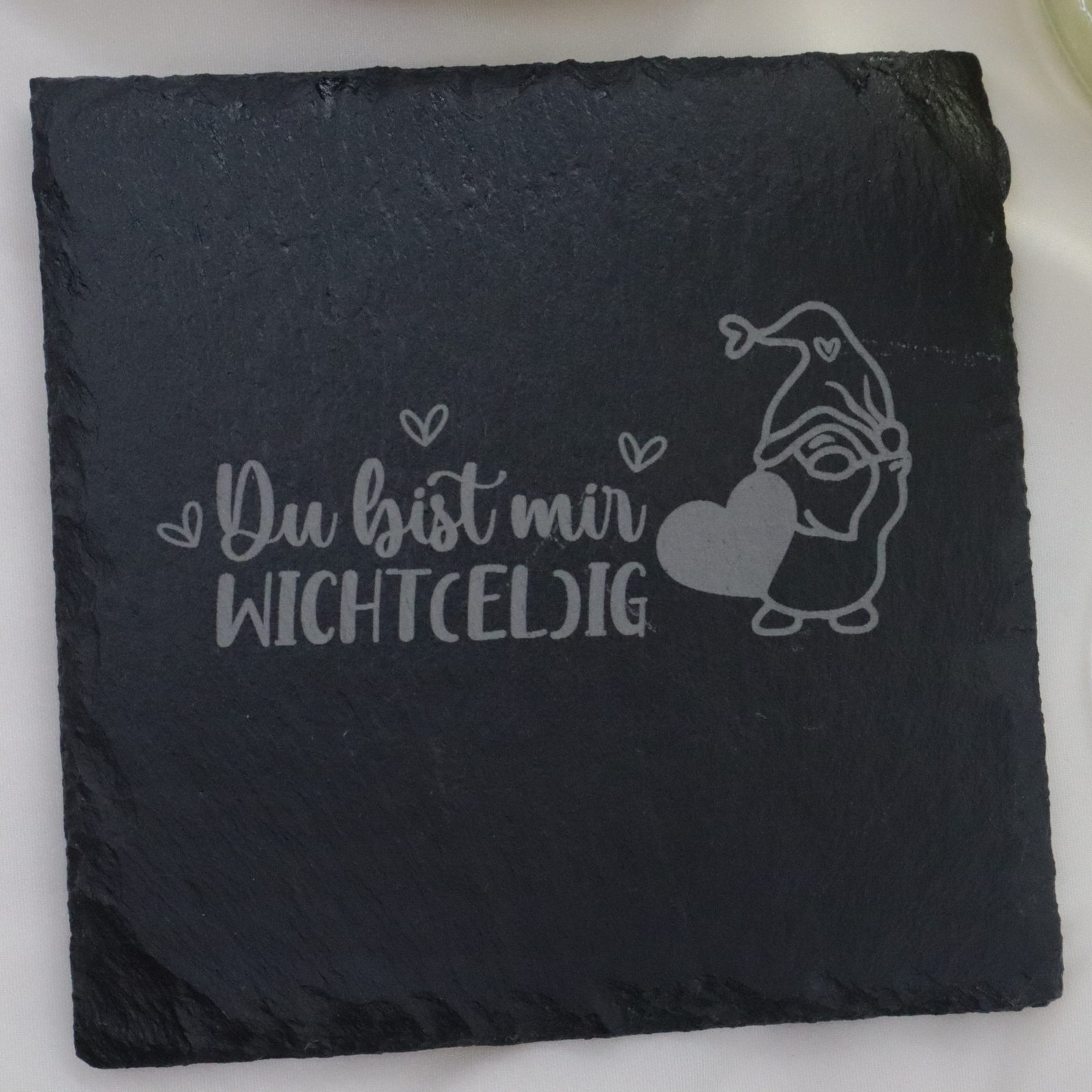Setzen Sie ein Zeichen der Wertschätzung mit unseren hochwertigen Schieferuntersetzern, graviert mit der herzlichen Botschaft: „Du bist mir Wicht(el)ig“