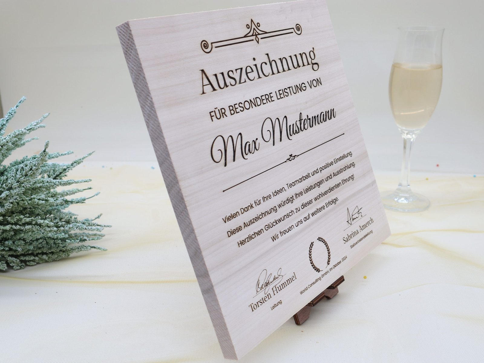 Suchen Sie nach einer stilvollen und bleibenden Auszeichnung für einen verdienten Mitarbeiter, Chef oder ein Unternehmen? Unsere personalisierte Trophäe aus massivem, unbehandeltem Pappelholz ist die perfekte Wahl, um besondere Leistungen zu würdigen. Der Name, die persönliche Widmung und auf Wunsch sogar Unterschriften werden durch eine edle Lasergravur tief in das Holz eingebracht, wodurch die Trophäe zu einem einzigartigen und individuellen Ehrenzeichen wird.