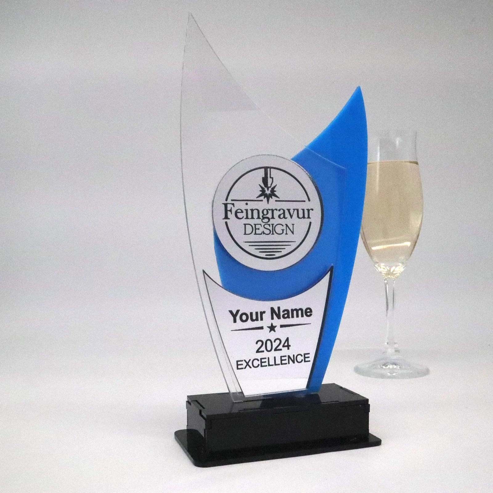 Moderne edle Sport Trophäe, eigener Text Logo, farbiges und klarem Acryl – Personalisierte Gravur – Pokal – Auszeichnung – Elegante Ehrungen