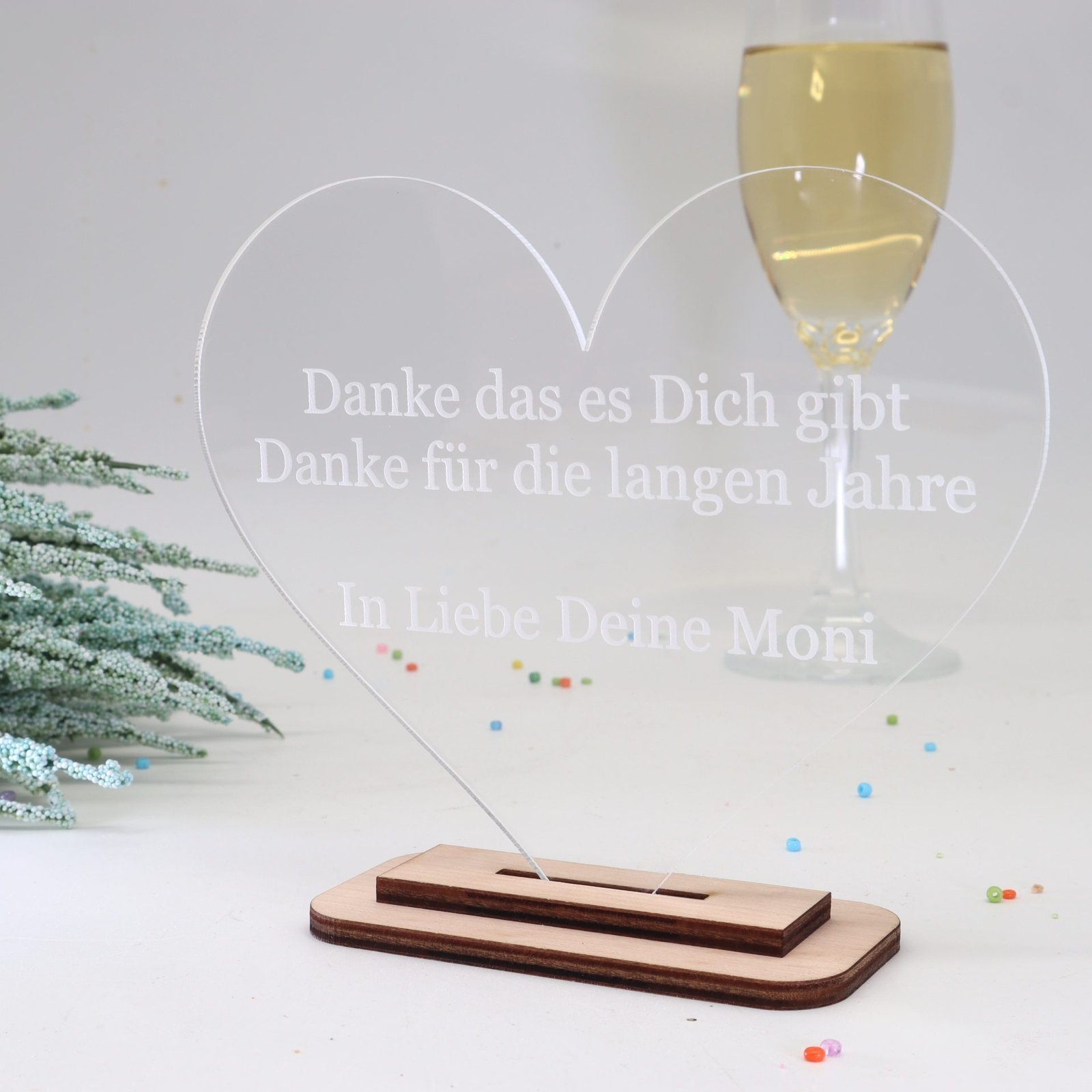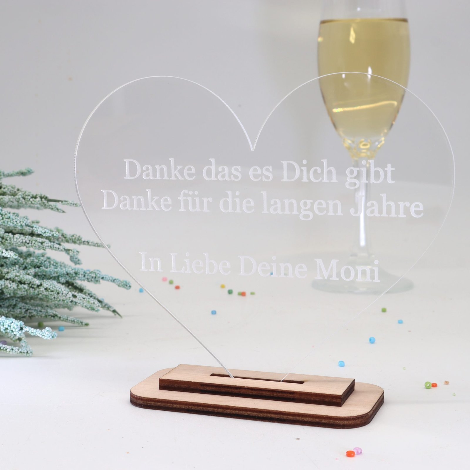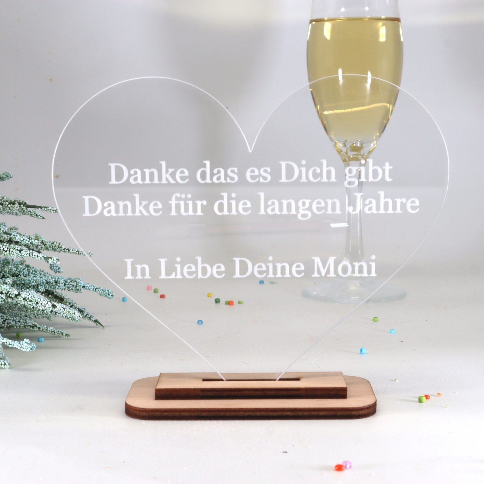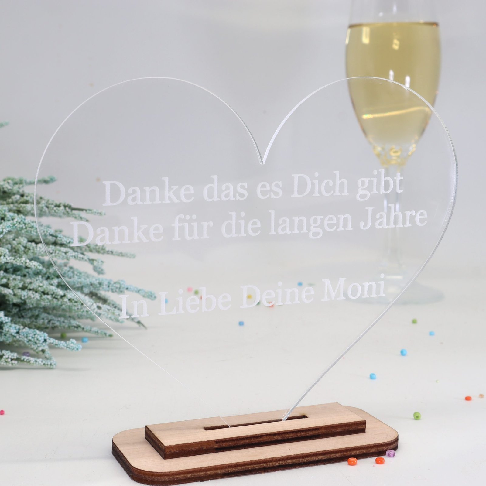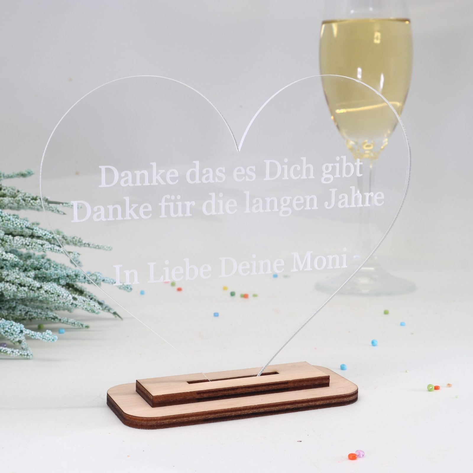 Unser exquisites personalisiertes Herz aus durchsichtigen Acryl mit einem Holzständer aus feinstem Ahorn ist eine einzigartige und liebevolle Geschenkidee für verschiedene Anlässe und ein kleiner Liebesbeweis.
