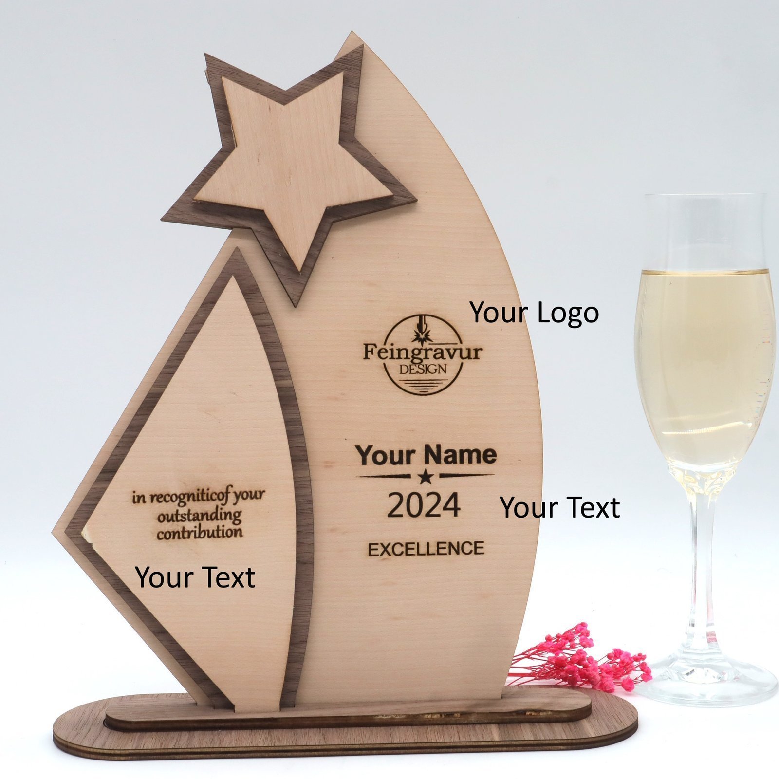 Moderne edle Trophäe, eigener Text oder Logo, aus wertvollem Nussbaum und feinem Ahorn – Personalisierte – Pokal – Auszeichnung – Elegant
