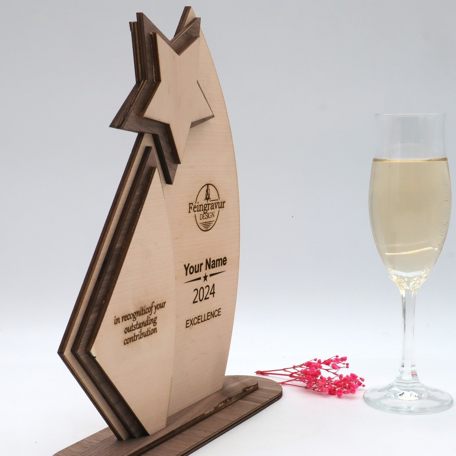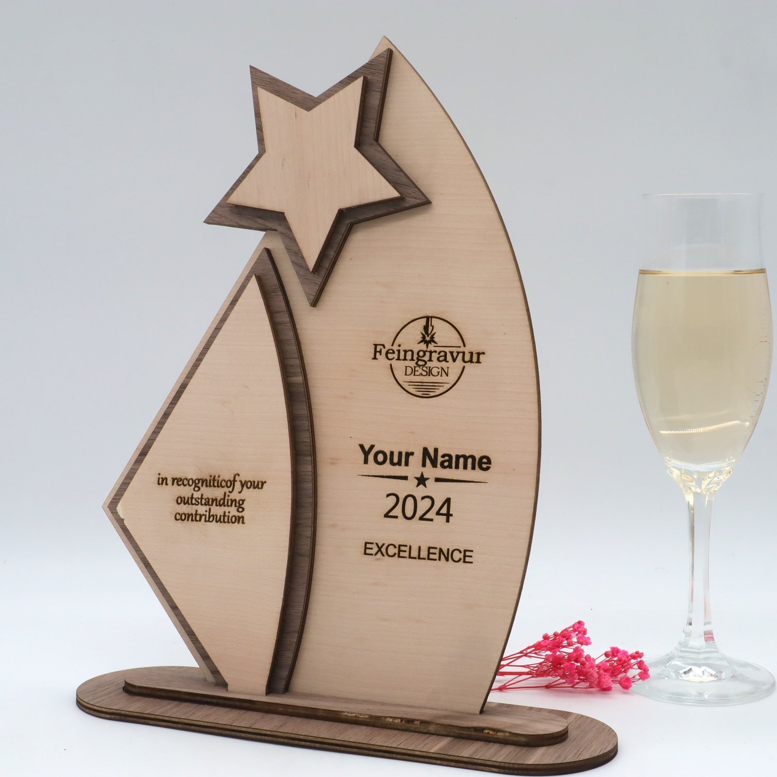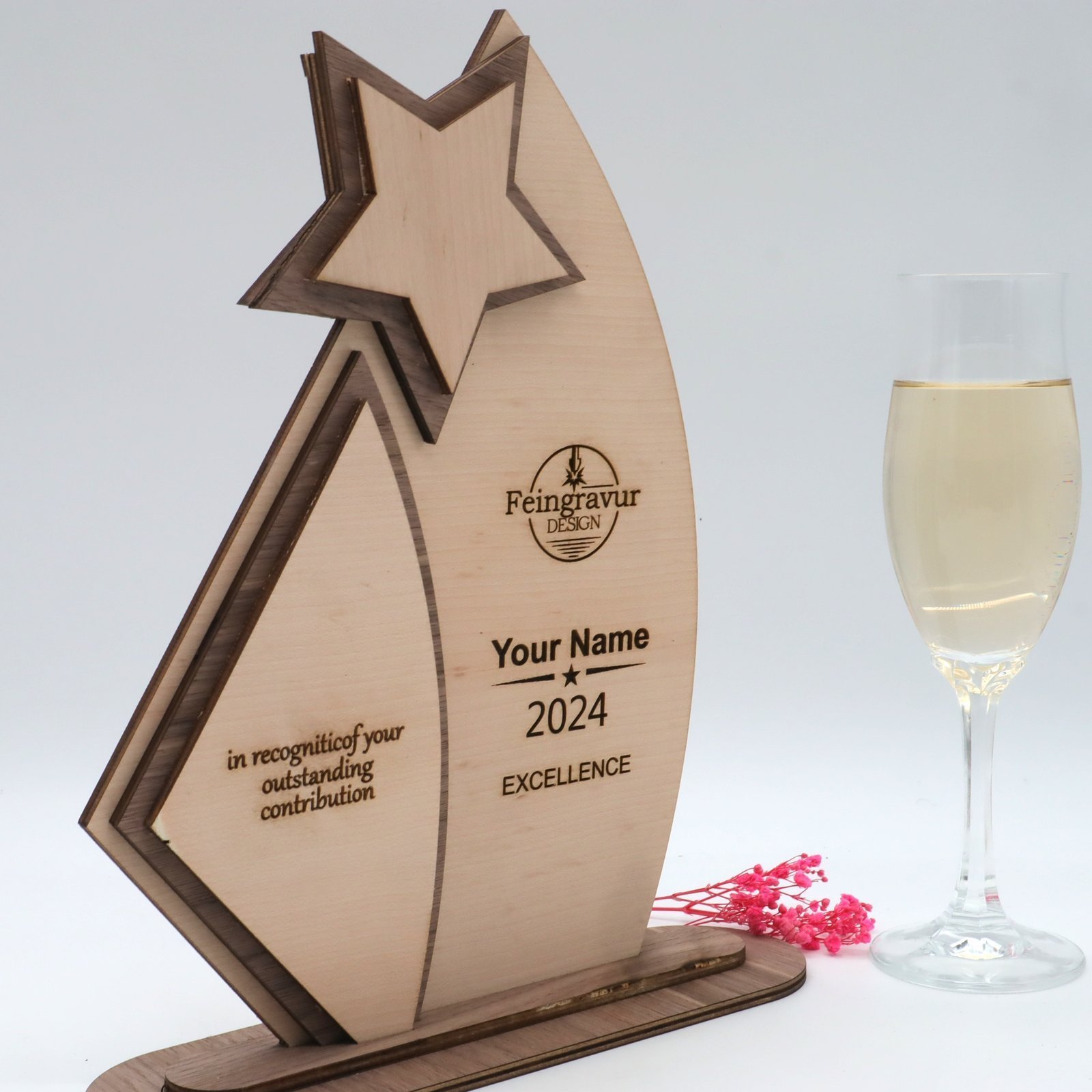 Eleganz in Harmonie – Die Trophäe aus edlem 5 mm Nussbaum mit feinstem 5 mm Ahorn und persönlicher Gravur.