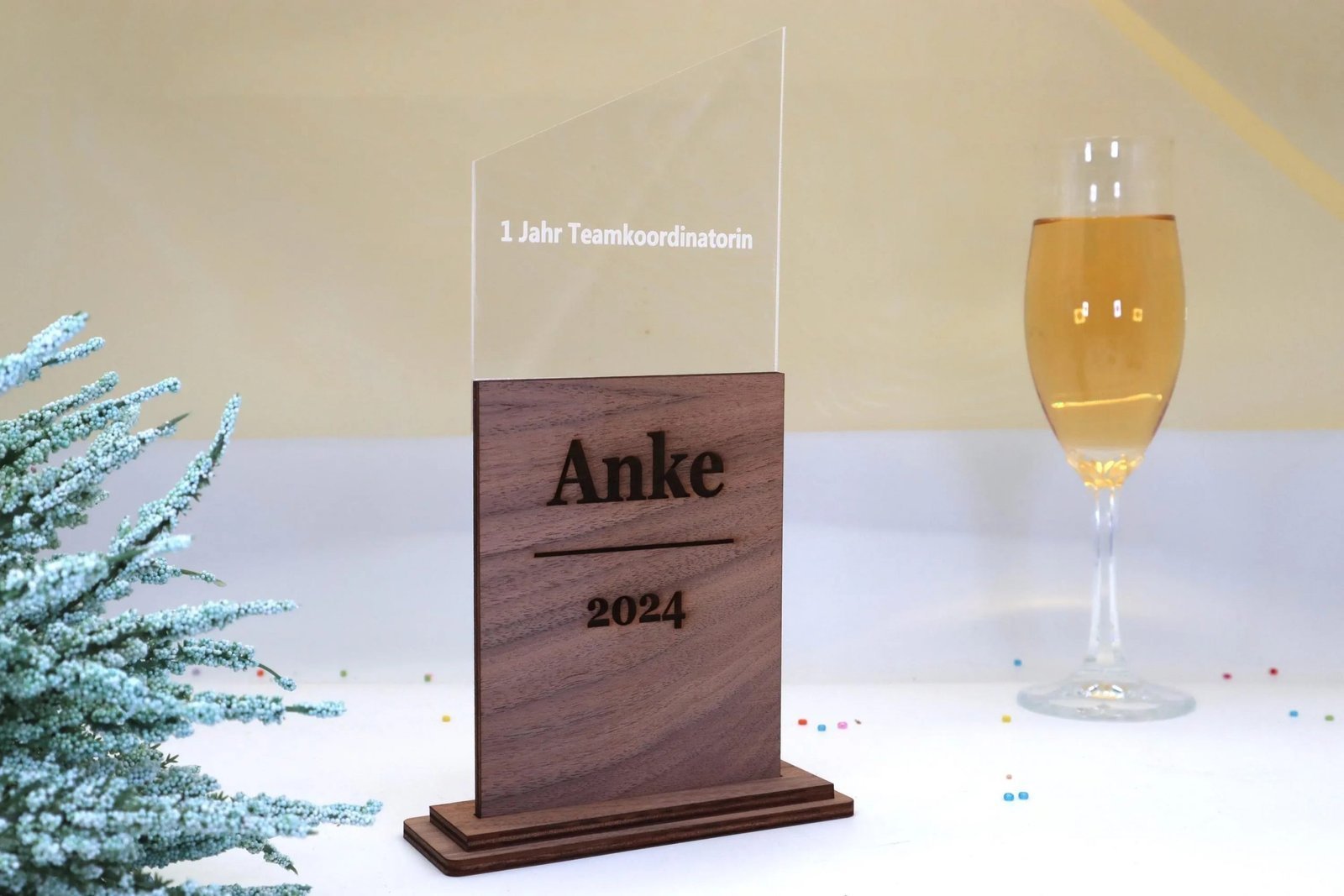 Eleganz in Harmonie – Die Trophäe aus edlem Nussbaum mit Acryl und persönlicher Gravur.
