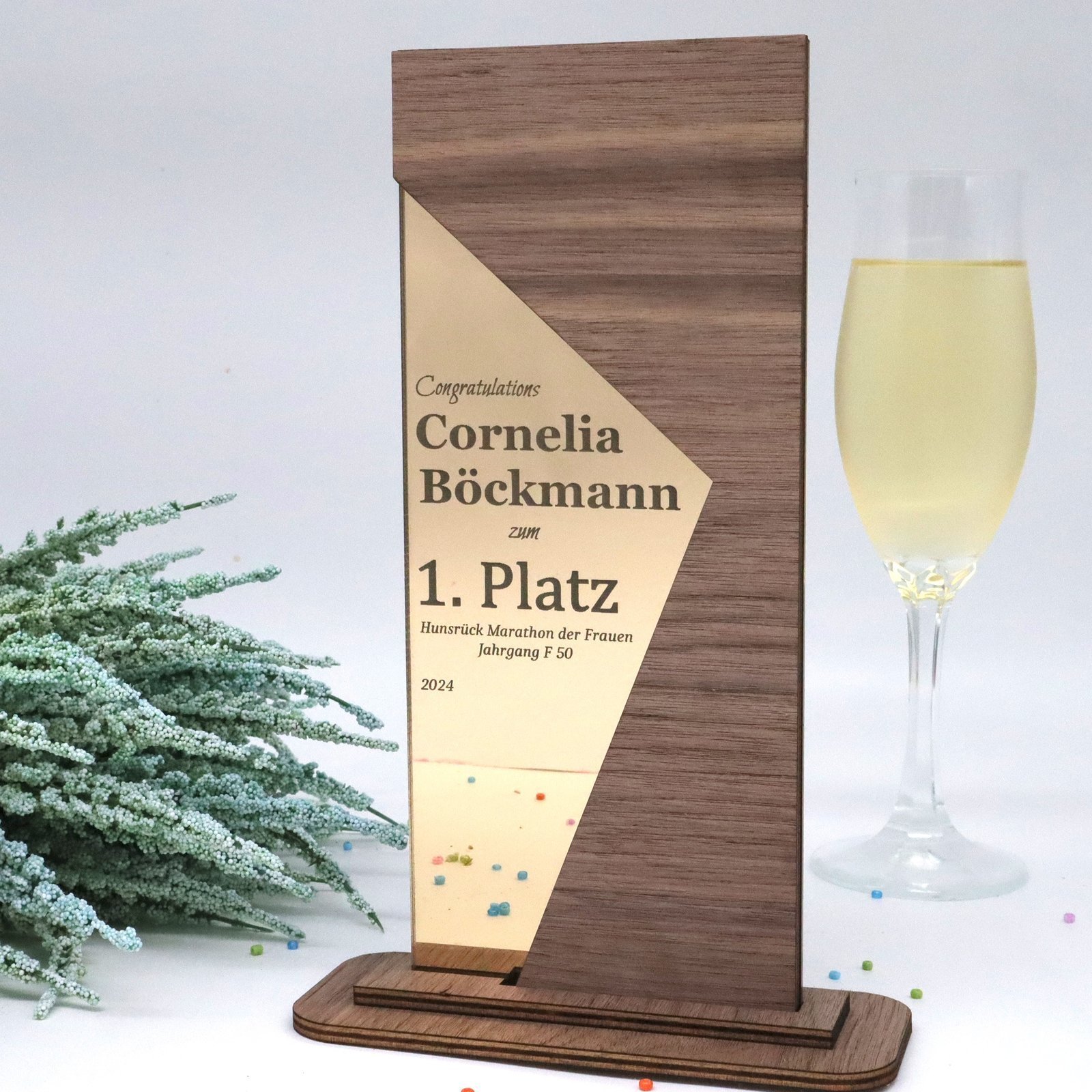 Eleganz in Harmonie – Die Trophäe aus edlem Nussbaum mit erstklassigen Spiegel Acryl und persönlicher Gravur.
