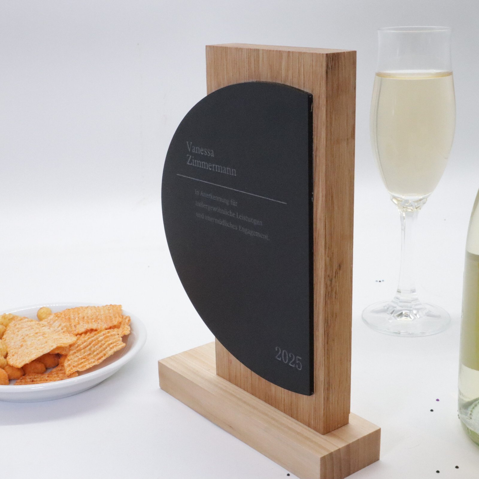 Der Sockel aus hochwertigem Eichenholz sorgt für Stabilität und Wärme. Er bildet einen stilvollen Kontrast zum transparenten Acryl und verleiht dem Award eine harmonische Balance zwischen Natur und Innovation.