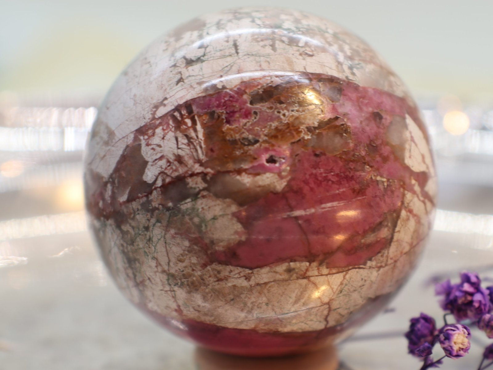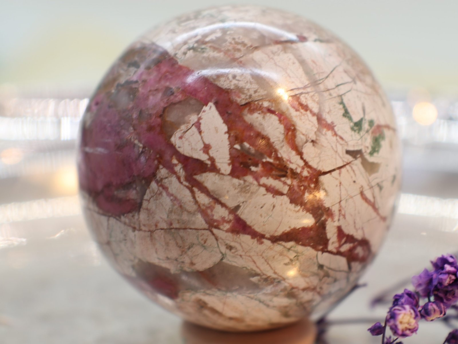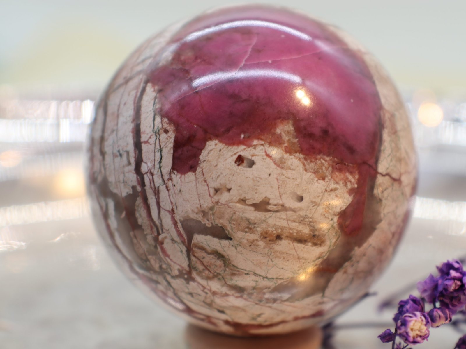 Eine seltene Cobalt-Cobalto-Calcit-Edelsteinkugel in hoher Qualität ist ein wahres Sammlerstück. Sie zeigt eine lebendige, intensive rosa bis magentafarbene Färbung, die durch die hohe Konzentration von Cobalt im Mineral entsteht. Die Oberfläche ist glatt poliert und hat einen starken Glanz, der das Licht auf eine brillante Weise reflektiert und die satten Farbtöne noch lebendiger erscheinen lässt. Innerhalb der Kugel können gelegentlich zarte weiße Adern oder kristalline Strukturen zu sehen sein, die der Kugel eine interessante Textur und Tiefe verleihen.