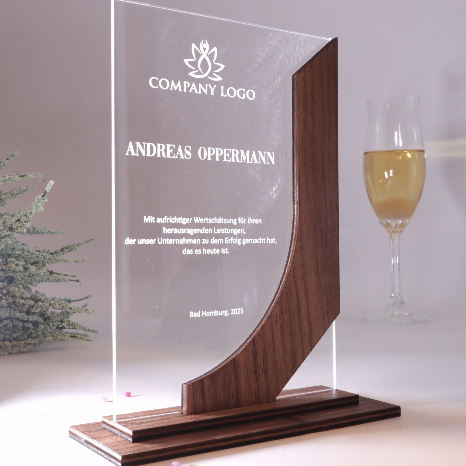 Personalisierter Award, Pokal und Trophäe, Acrylglas und Nussbaum