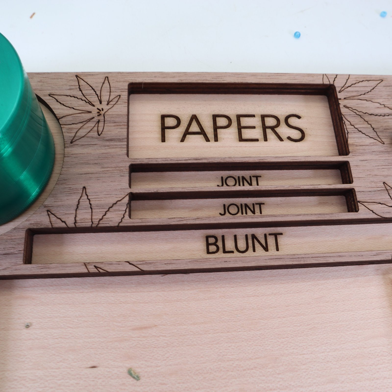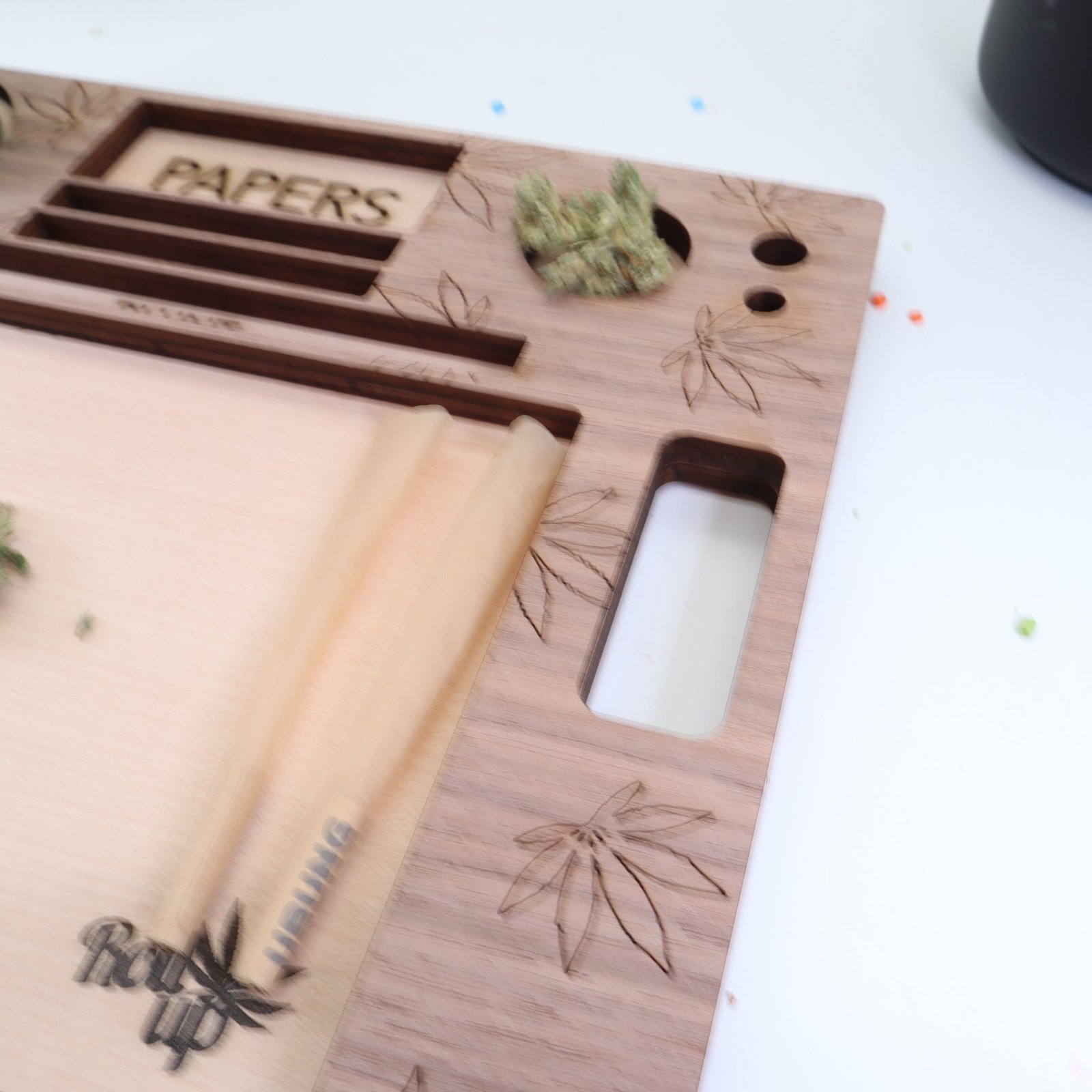 Die verschiedenen Ablagefächer des Rollbretts bieten nicht nur ausreichend Platz, um all deine Requisiten ordentlich zu platzieren, sondern helfen auch dabei, alles organisiert und griffbereit zu halten. Von deinen Lieblingsblüten über Feuerzeuge bis hin zu Pfeifen – alles hat seinen Platz auf diesem kunstvollen Brett.
