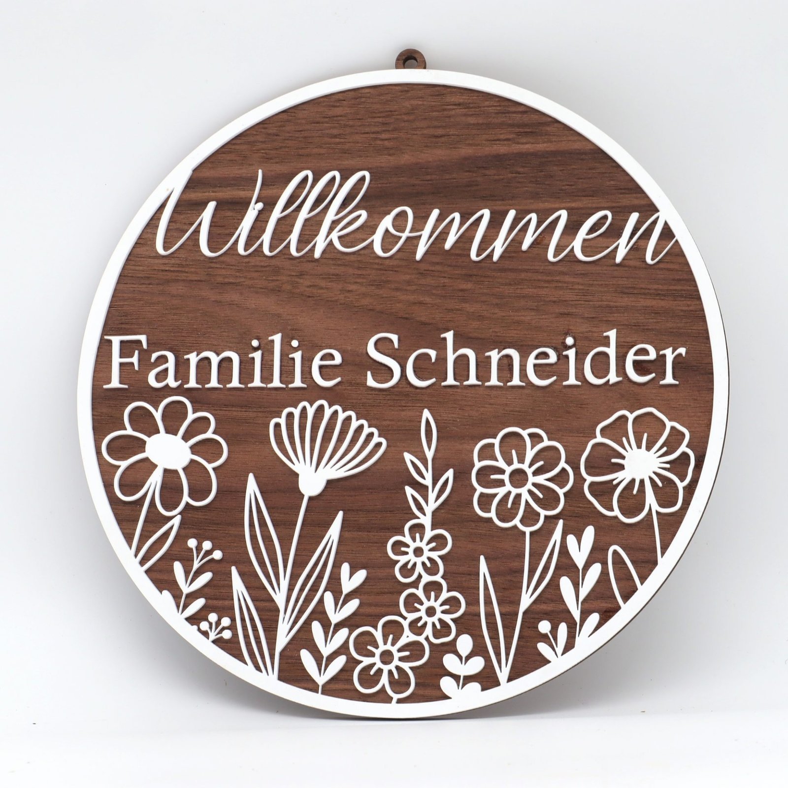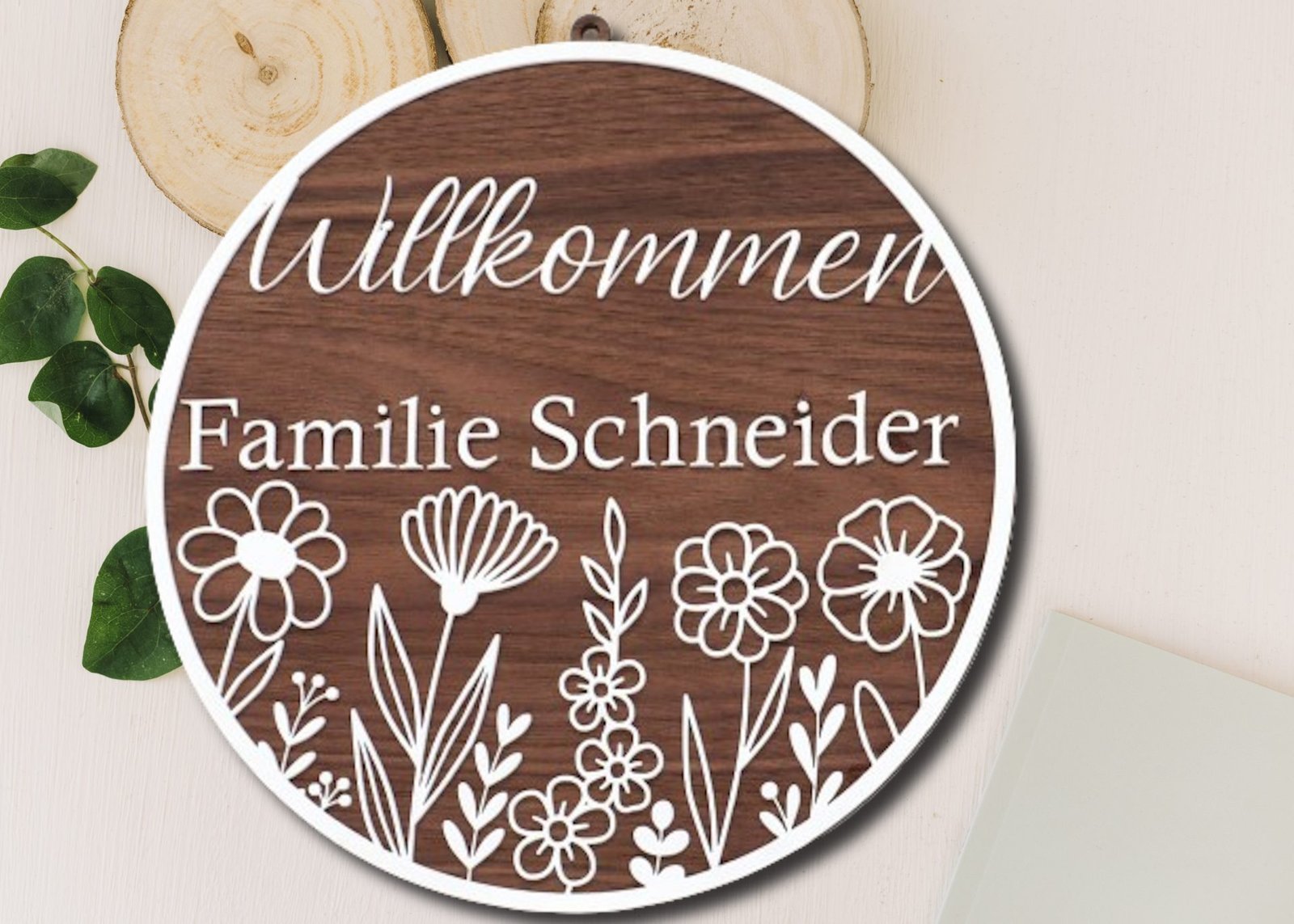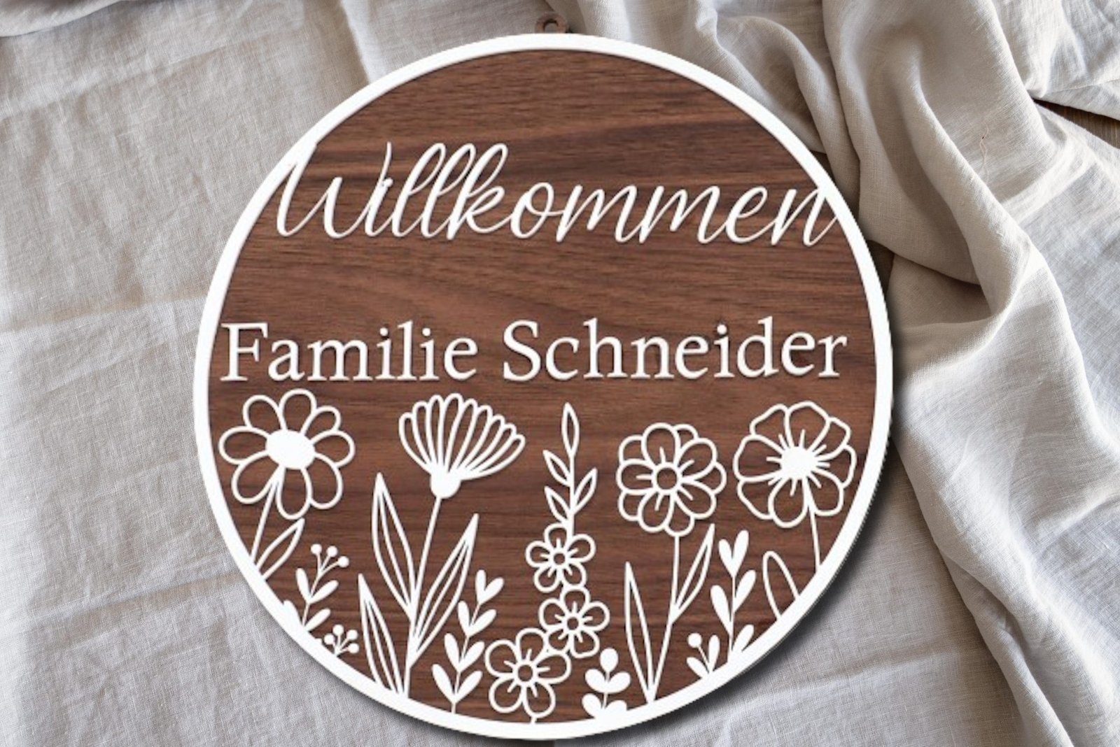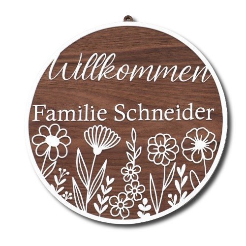Begrüßen Sie Ihre Gäste mit einem Hauch von natürlicher Eleganz durch unser Rundes Willkommen-Türschild mit Familiennamen und einer bezaubernden Wildblumen-Gravur. Dieses kunstvoll gestaltete Accessoire ist nicht nur eine Hommage an die Schönheit der Natur, sondern auch eine individuelle Note für Ihren Eingangsbereich.