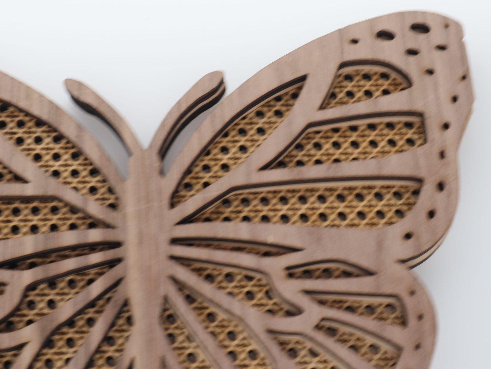 Suchen Sie nach einem Wandbild, das Ihr Zuhause schmückt und gleichzeitig Ihre Persönlichkeit widerspiegelt? Dann ist der Schmetterling aus hochwertigem Nussbaum Sperrholz und Ahorn Ratanmuster mit einem Laser ausgeschnitten, das perfekte Kunstwerk für Sie!