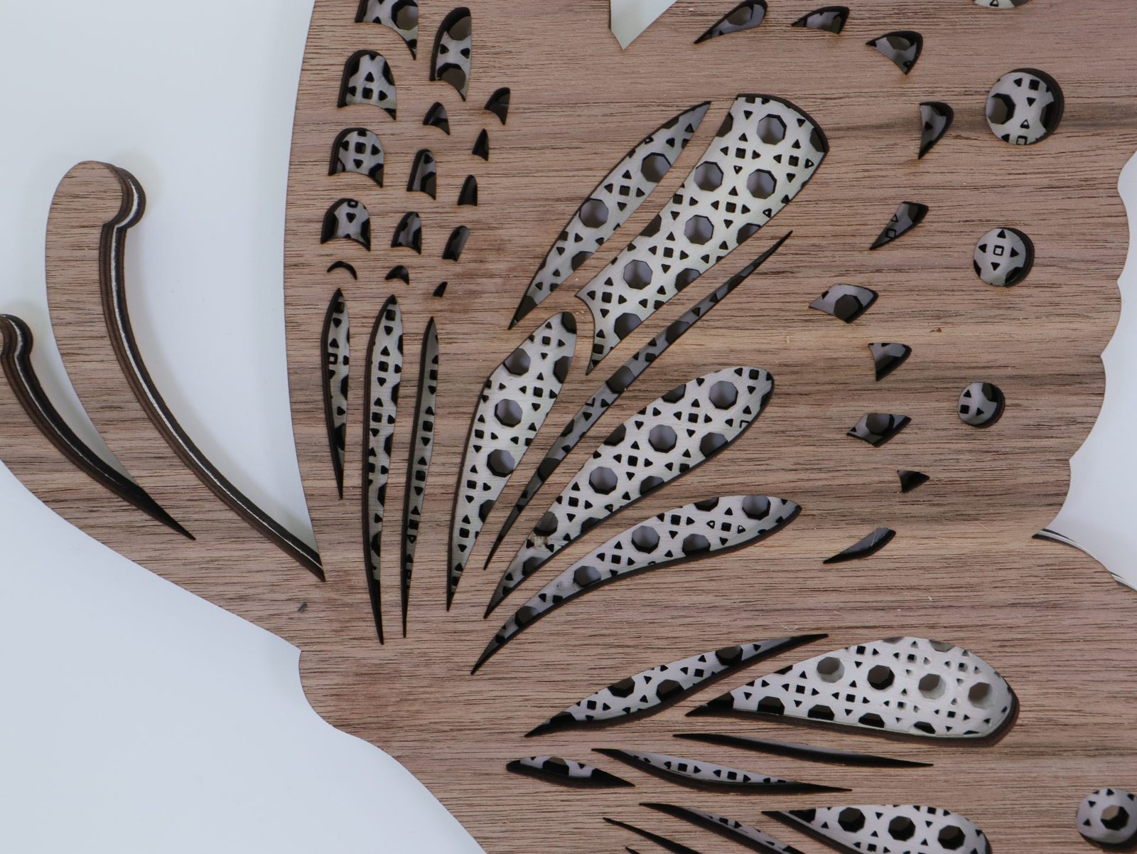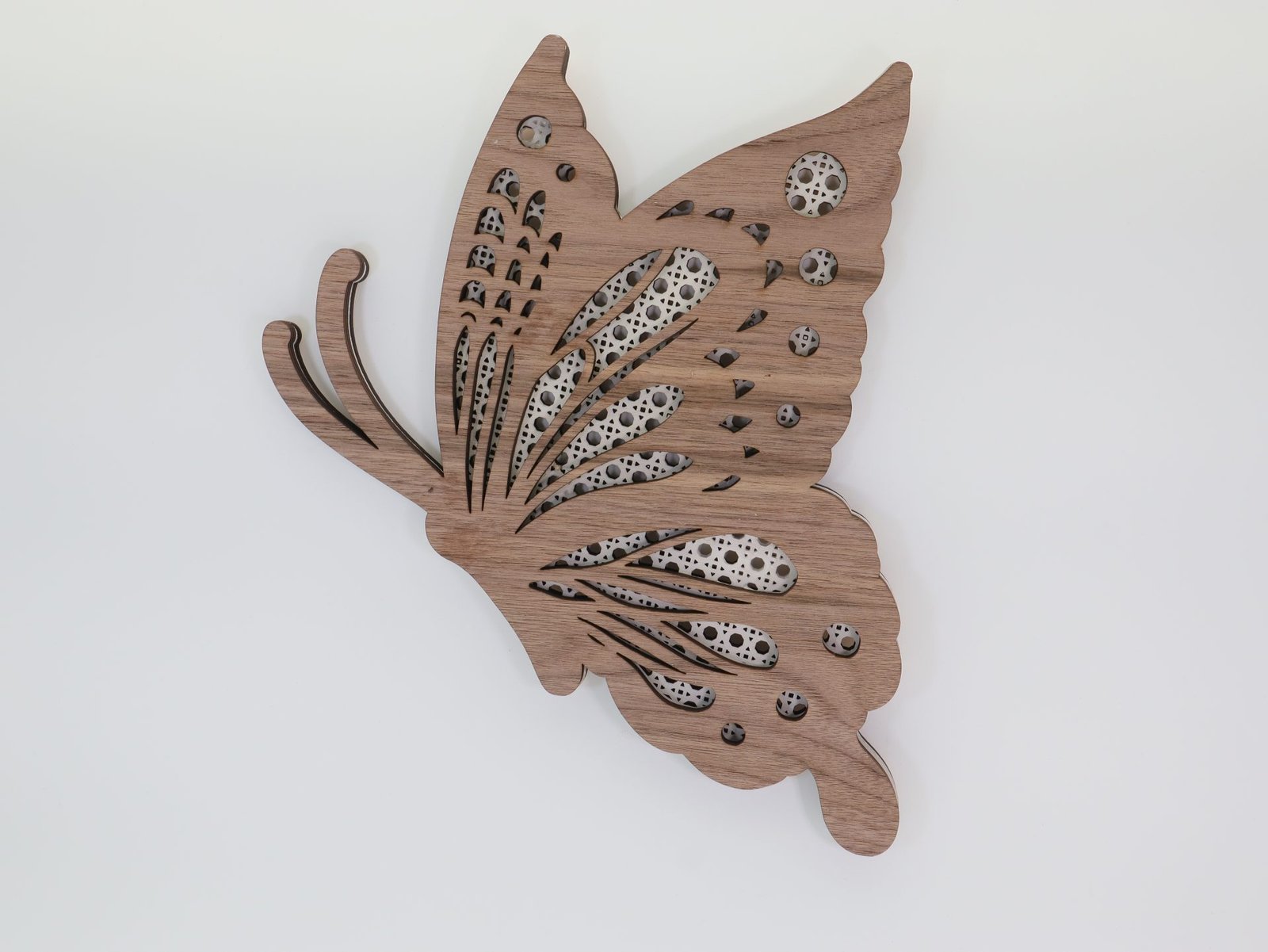 Suchen Sie nach einem Wandbild, das Ihr Zuhause schmückt und gleichzeitig Ihre Persönlichkeit widerspiegelt? Dann ist der Schmetterling aus hochwertigem Nussbaum Sperrholz und Ahorn Rattanmuster mit einem Laser ausgeschnitten, das perfekte Kunstwerk für Sie!